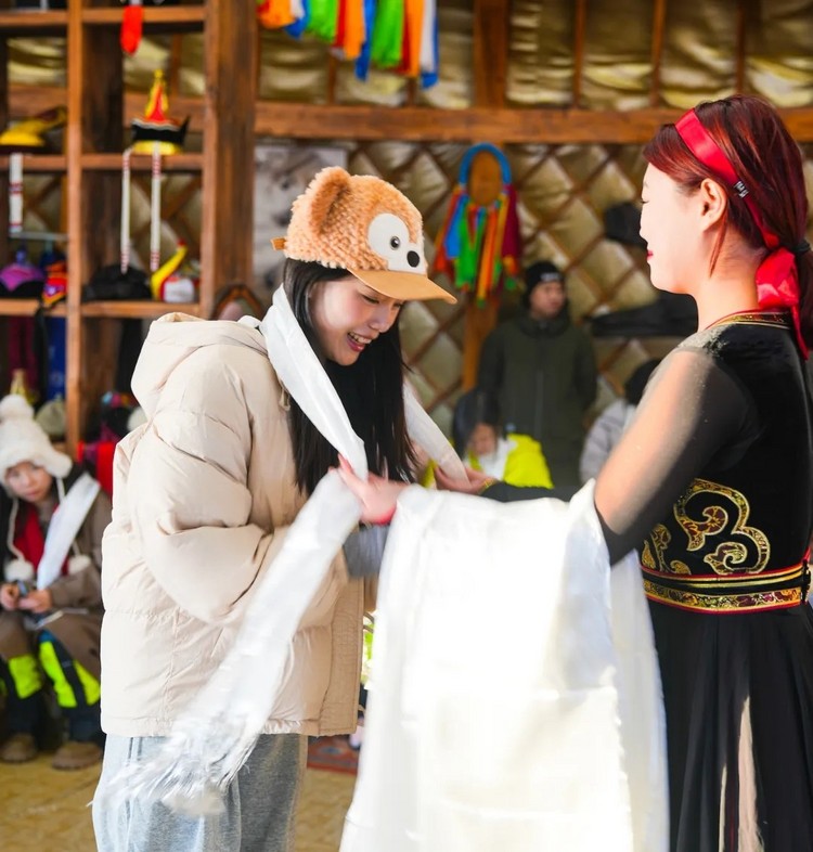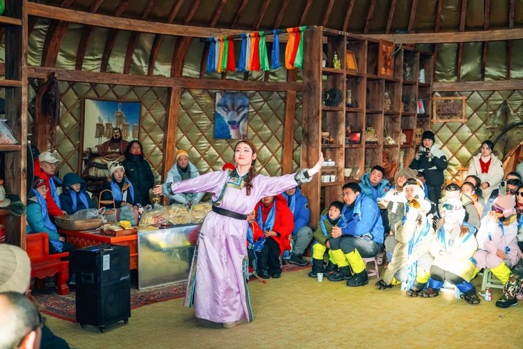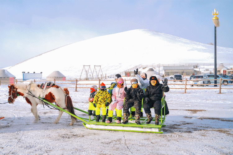 雪地爬犁、高山滑雪(不限次数)、驰骋雪原、拔河打雪仗、参加祭火大典、换上色彩鲜丽的冬季蒙古袍蒙古帽体验蒙古舞蹈……N+玩法让这里成为“雪原迪士尼”。