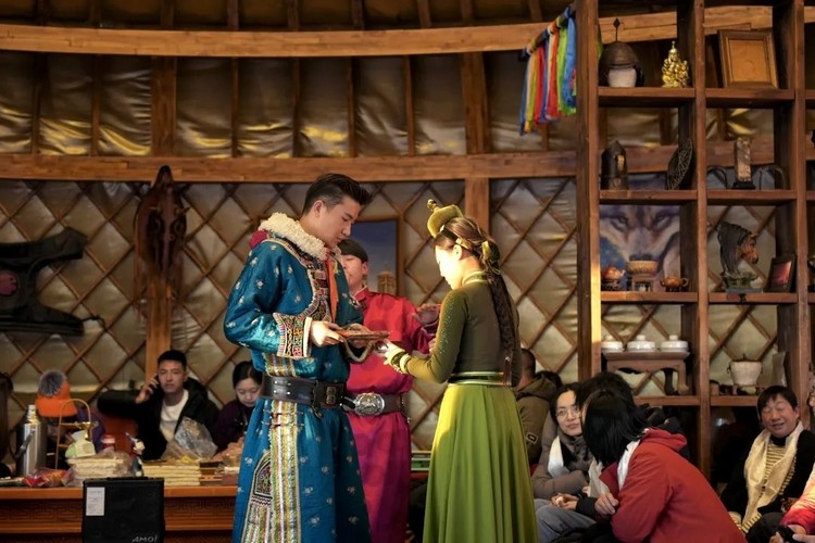 大家要要双手接过酒碗,用右手无名指蘸少许酒水,上敬天,下敬地,再轻点自己脑门,一口干了这杯酒,才不负蒙族人民的热情。