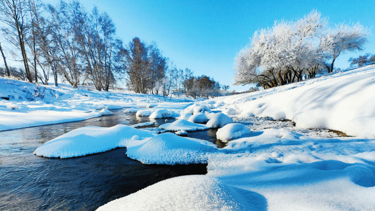 邂逅乌兰布统的「雪国风光」,从小河头村的日出开始。河流中有着晶莹剔透的冰花,冬日的早晨雾气弥漫在河流上,枝头挂满雾凇。