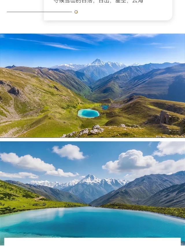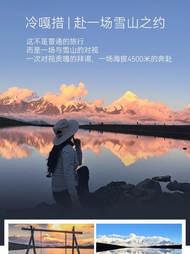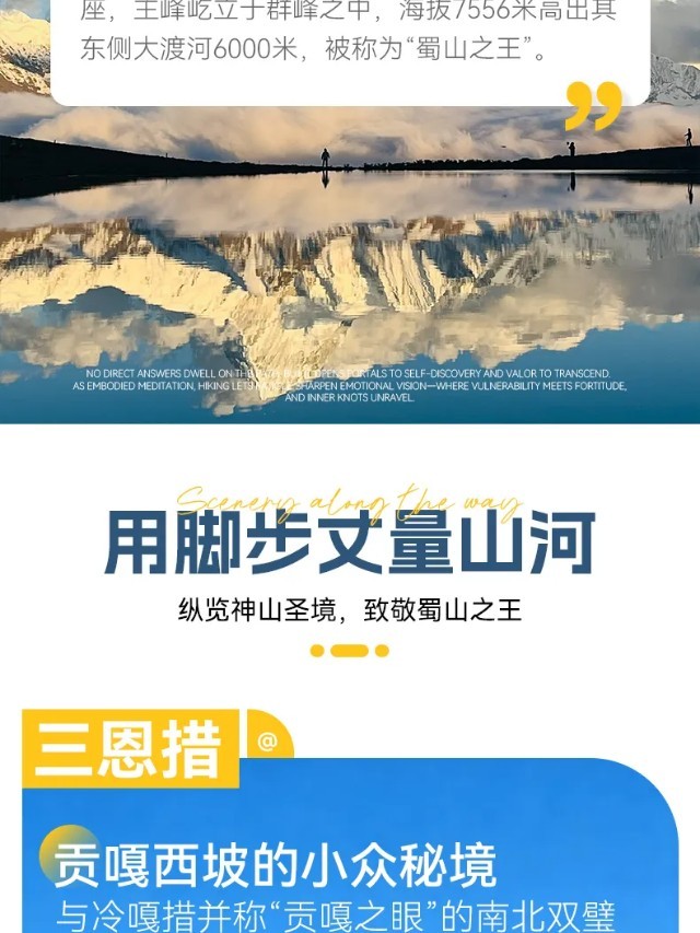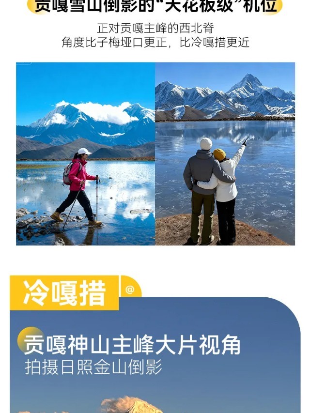 行程概览:本日上午适时出发,乘车前往帮木吉德,徒步上山,先前往三恩措,欣赏沿途的美景,下午沿半山腰横切,徒步前往冷嘎措湖畔,欣赏冷嘎措的湖光山色,守候贡嘎群山的日落金山与倒影,傍晚适时下山,在领队的带领下,返回上木居村客栈。