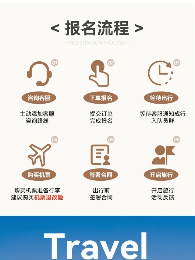 集合日晚上19:00整,领队会与大家开行前会,时间若有调整会另行通知。