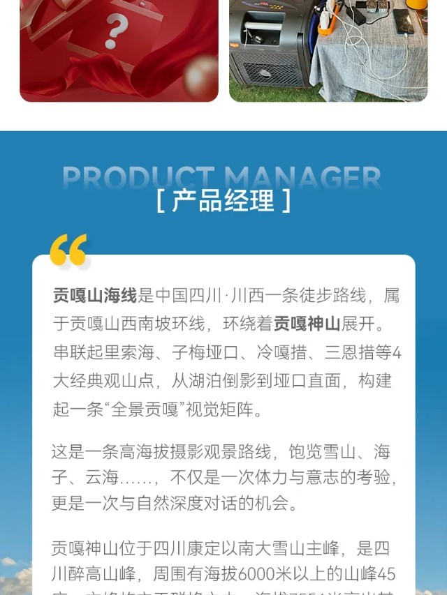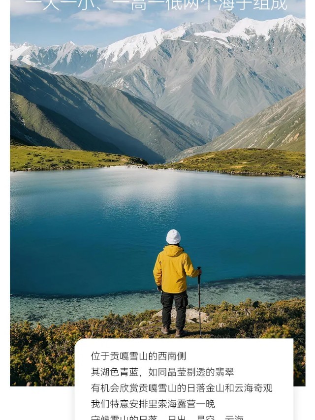 行程概览:吃过早餐后,咱们稍作休息,整理装备,先乘坐咱们中转车抵达今日徒步起点,开始咱们今日徒步之旅,今日路况相对较好、但全程上坡,只有最后1KM下坡,所以请大家合理分配体能,今日行程较为轻松,大家可以慢慢玩慢慢拍。下午到达今日营地里索海营地。营地位于贡嘎主峰对面,位置非常好,这里距离贡嘎雪山也是非常近,在这里拉开帐篷就能近距离观赏雪山冰川,在霞光中显得更加美轮美奂。
