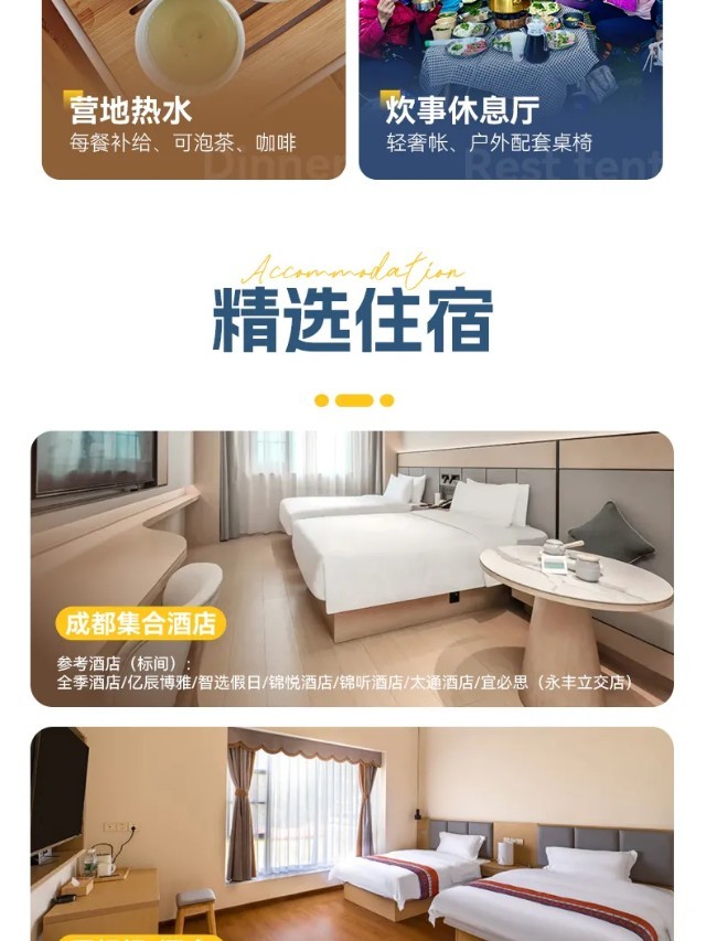 行程概览:今日全国各地的队友将来到成都集合。如果你时间宽裕,相信绝对会让大家深深地体会到什么是“休闲之都”啦!建议各位朋友尽量早些到达,漫步游走,在各类小吃及景点中感受慢生活的成都。还可以自行安排在成都市区的旅游活动,推荐游玩地点:【锦里古街】、【武侯祠】、【宽窄巷子】,以及国内十大商业街之一的【春熙路】。美食推荐:在锦里和宽窄巷子有众多成都小吃:龙抄手、担担面、肥肠粉、冒菜。品尝成都特色美食,感受慢成都。