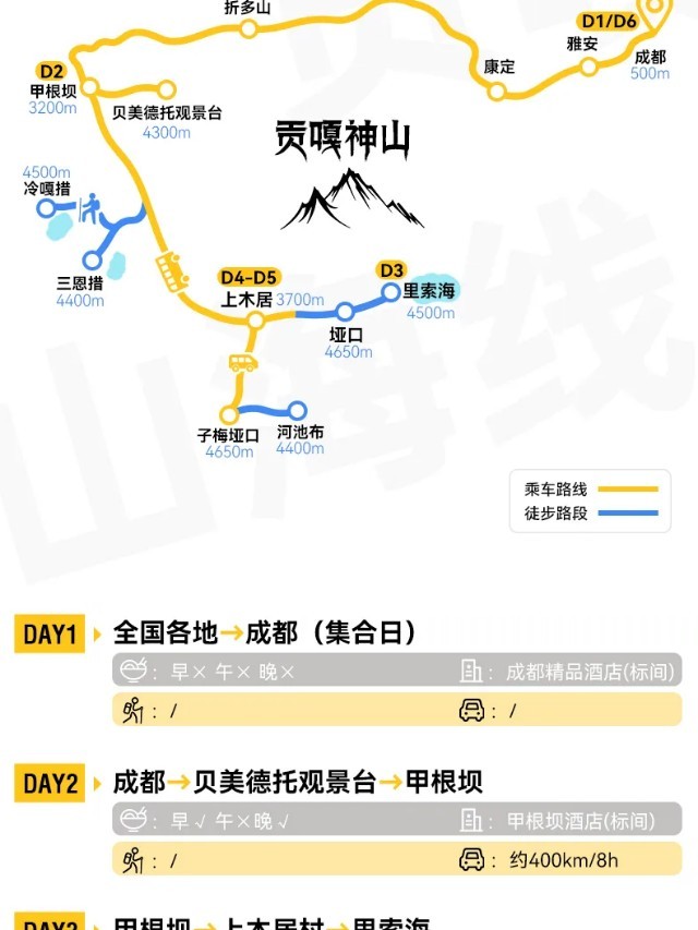 行程概览:车程公里数较长出发时间较早,正常出发时间为早上7:00-7:30(具体时间以领队通知为准)。沿G318国道向东穿越折多山垭口(海拔4298米)。此段为全程海拔最高点,可最后回望贡嘎群峰,云海翻涌时如行于天界之脊。最后康定上高速一路到达成都。 (正常情况下抵达成都时间约为18:00,由于四川的交通状况不是十分的理想,可能会因为修路、交通管制,堵车耽误时间,实际到达时间可能更晚。所以建议大家尽全购买第二天离开成都的机票或火车票!)