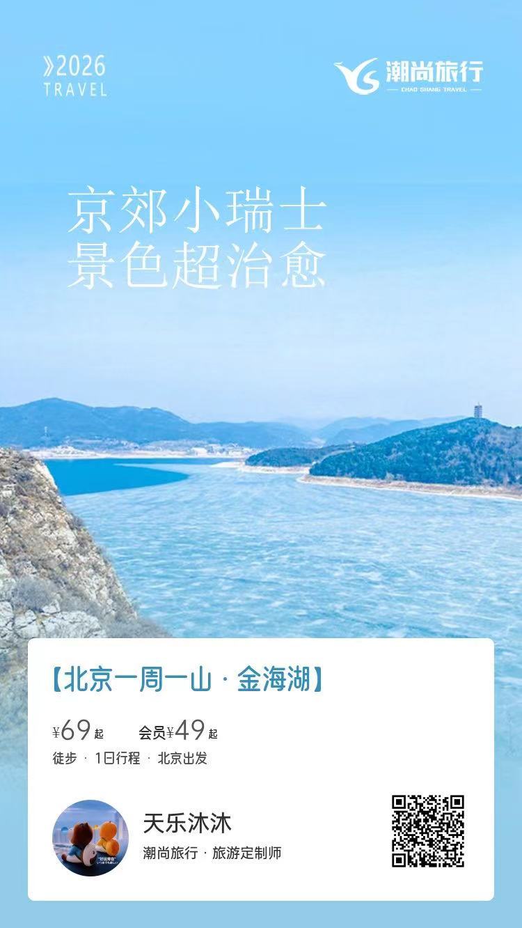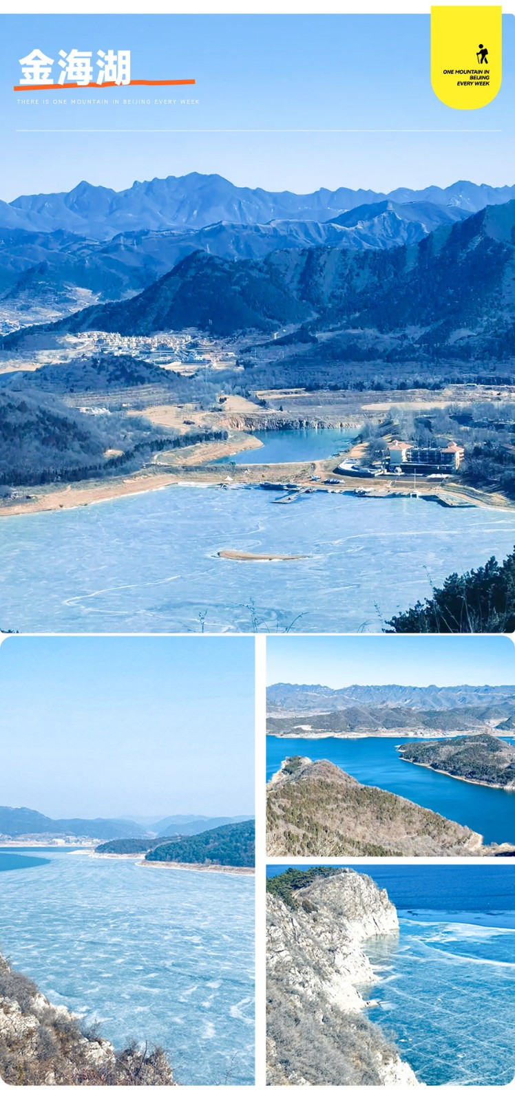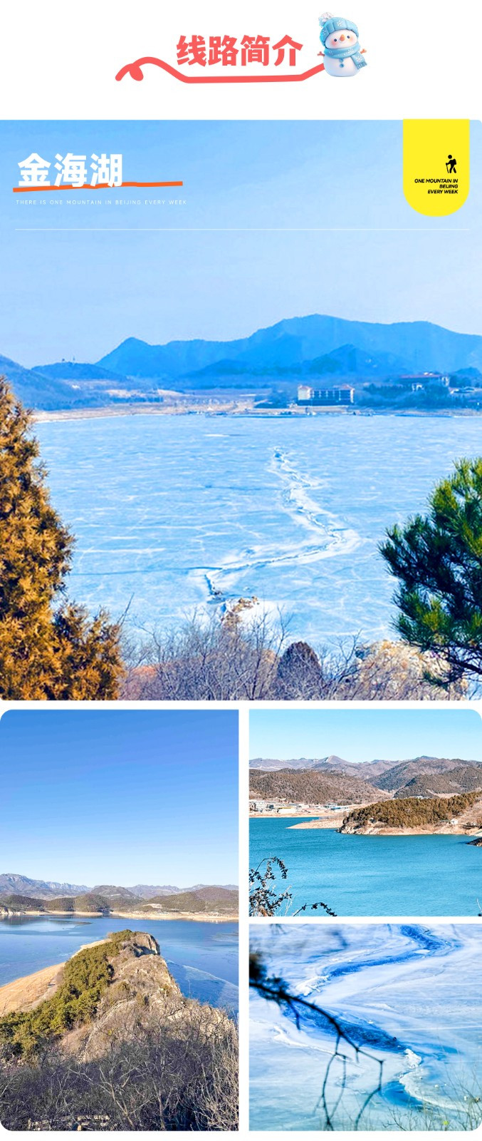 金海湖位于北京市平谷区,三面环山,水域辽阔,素有“小北戴河”之称,是京郊著名的休闲徒步目的地。 这里森林覆盖率高,空气清新,湖光山色相映成趣,被誉为“京郊小瑞士”。金海湖冬季徒步是一条融合湖光山色与山野挑战的休闲路线,冬季湖面可能结冰或雾气缭绕,景色空灵治愈。