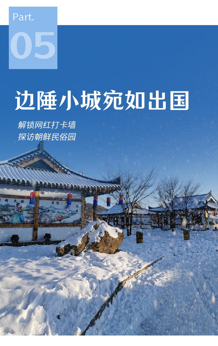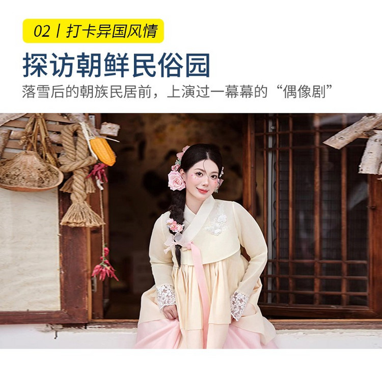 10:30参观 【中国朝鲜民俗园】这里是来延吉一定不能错过的拍照宝地,由40栋朝鲜族民族风格的建筑群组成,我们在这里可以深切的体会到朝鲜族同胞衣食住行的特点,展现了石匠、渔夫、农夫、陶艺、富有等不同家庭的生活场景。