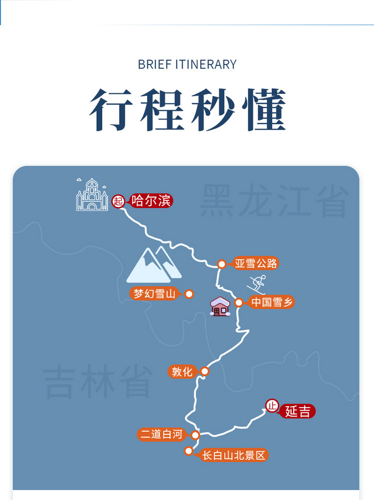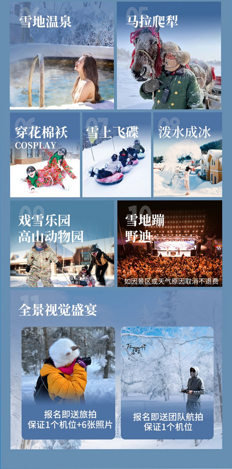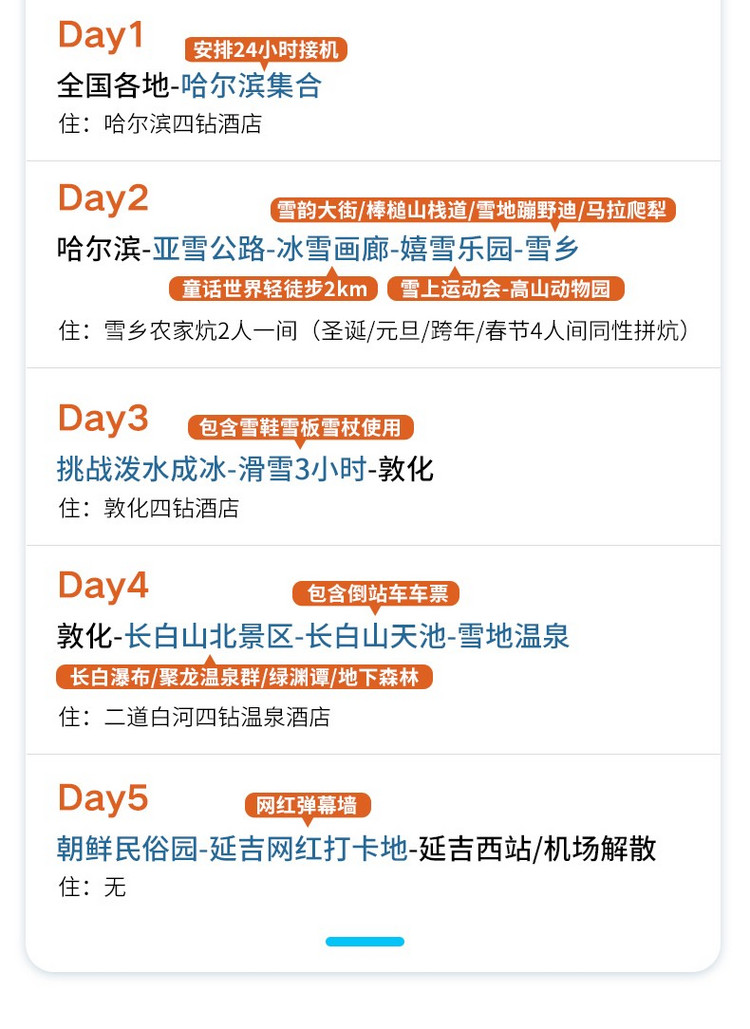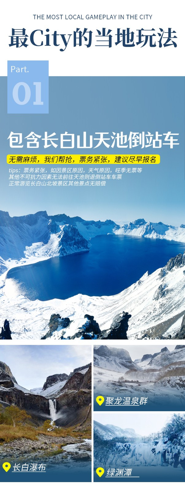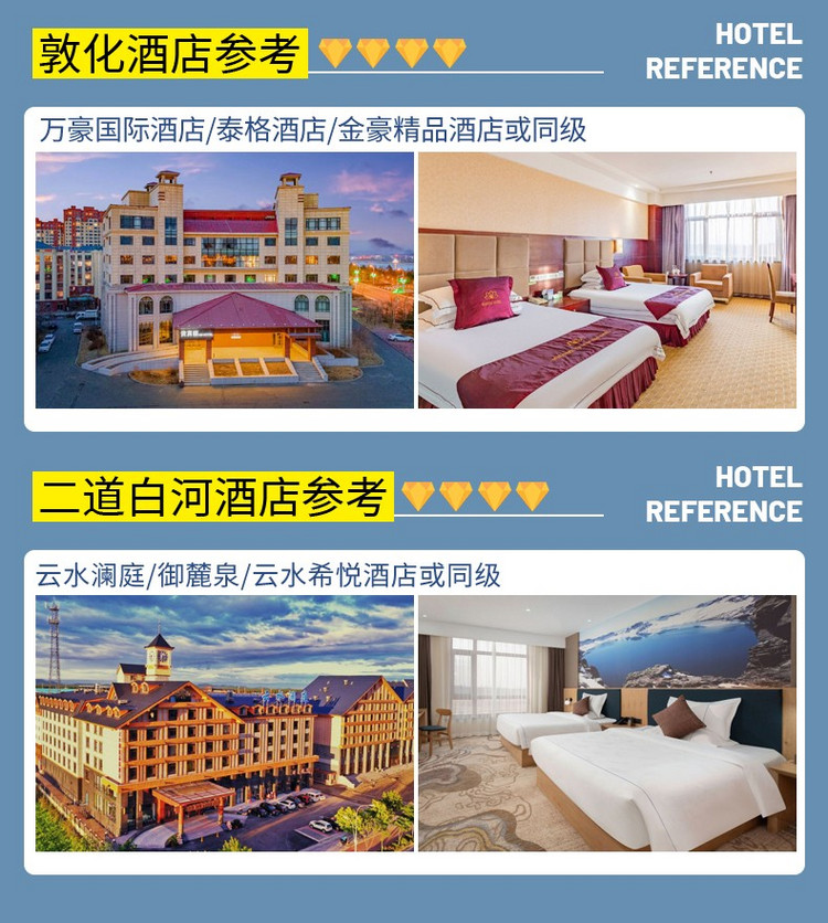 5、长白山由于冬季火爆限流前往,票务紧张,建议尽早报名好提前帮抢长白山天池倒站车票;如因景区原因、天气原因、旺季无票或者其他不可抗力因素无法前往则取消前往,退倒站车费用,其他景点正常游览无退费无赔偿。