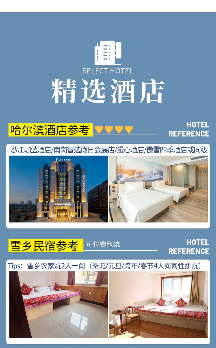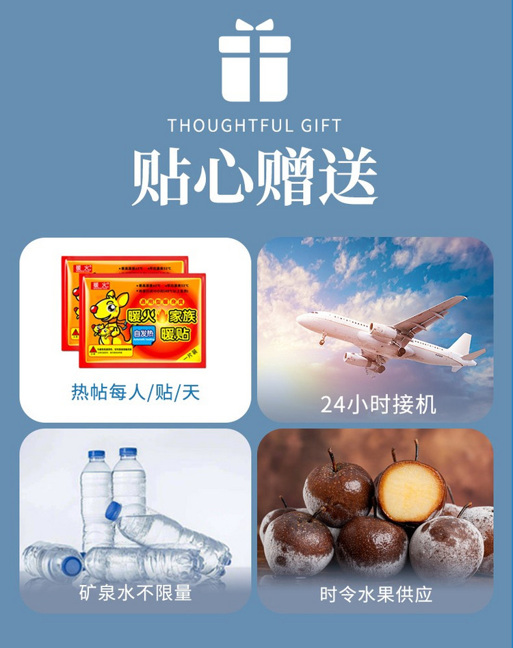 1、雪乡因条件有限不提供一次性洗漱用品和吹风机,请提前自备。