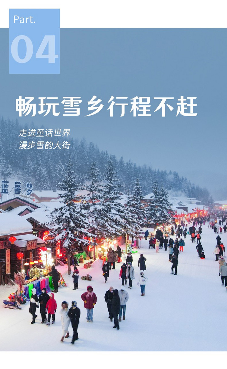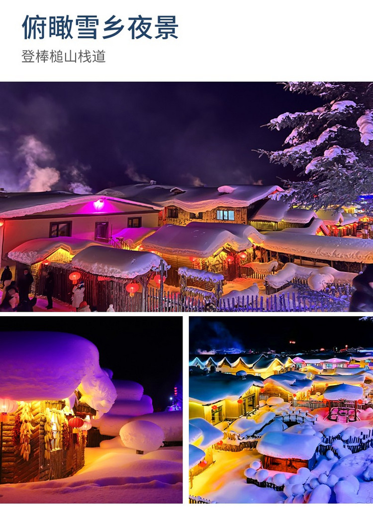 17:00 随后雪乡内自由玩耍,可以走走雪韵大街,欣赏雪房子,寻找雪蘑菇,还可穿上乡村特色的花棉袄COSPLAY。东北冬季日落时间非常早,大约四点多的时候天就已经黑了,可以漫步棒槌山栈道,俯瞰【雪乡夜景】红红的灯笼映在洁白的雪地上。也可参加雪乡景区举办的雪地蹦迪晚会,(如遇景区原因或大风等天气原因不举办不退费用)。