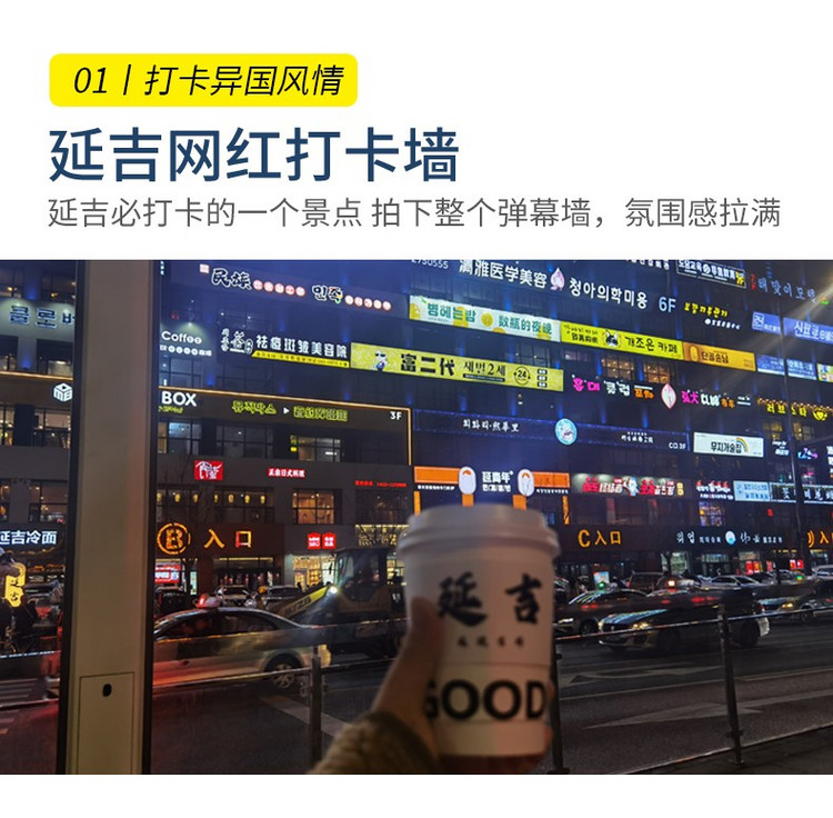 14:30 打卡【网红弹幕墙】,这里是延吉的标志性地标,也是近几年的网红打卡地,前来拍照打卡的人络绎不绝。尤其是晚上灯光亮起霓虹闪耀着五颜六色的朝鲜族文字,宛如来到了韩国首尔。