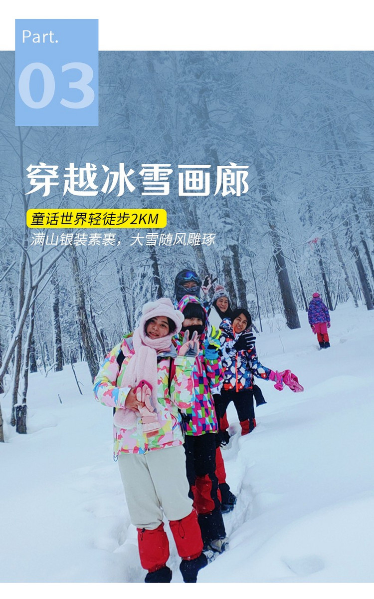 14:00 抵达【冰雪画廊】,满山银装素裹,大雪随风雕琢,在阳光的照耀下璀璨夺目、千姿百态,瞬间能把人们带入如诗如画的仙境,在这里轻徒步2KM,随后前往后【戏雪乐园】体验东北特有的交通工具【雪上飞碟】以及雪地长龙、雪地转转,堆雪人、打雪仗,属于东北独有的那份快乐。前往【高山动物园】与那些可爱的冰雪动物精灵亲密互动。