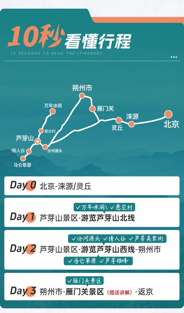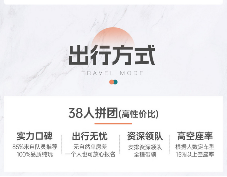 2、以上行程时间及顺序供参考,受天气、交通、景区调控及队员体能等不同影响有可能会调整,以领队实际安排为准;
