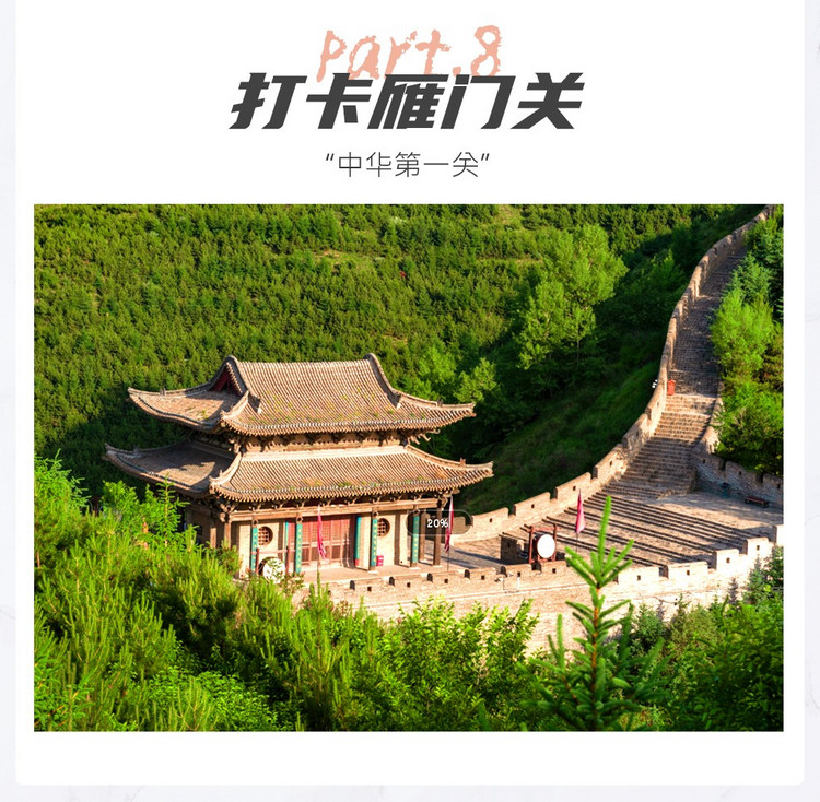 打卡景点:后腰铺、景区名人壁、明月楼、雁门关村、豹突泉、边贸街、瓮城门、地利门及宁边楼、关署、天险门及关楼、关城城廓、镇边祠、古关道、云际泉及雁池、关陵及壮士亭、盘古石、云际泉及雁池、观音殿、 分道碑、阜家坪、前腰铺