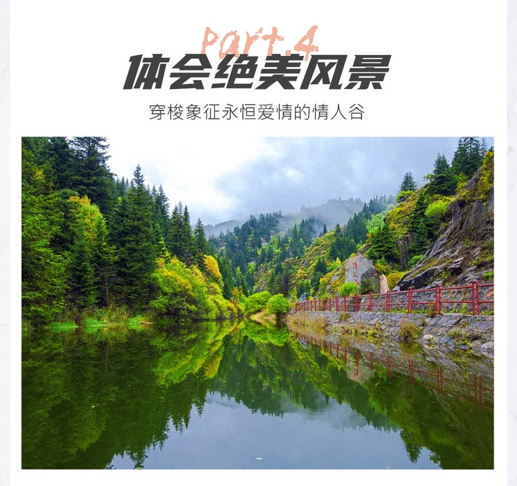 ·【情人谷】相传一对坚贞的情人在此地终成眷属,一条清溪自谷中流出,终年不断,象征情人之间缠绵的情丝,瀑布、石潭、山花野树、婉转鸟鸣以及峰回路转的小径,象征着爱情生活诸多况味。情人谷随季节变化各呈纷异,却一样的美丽,象征永恒的爱情。