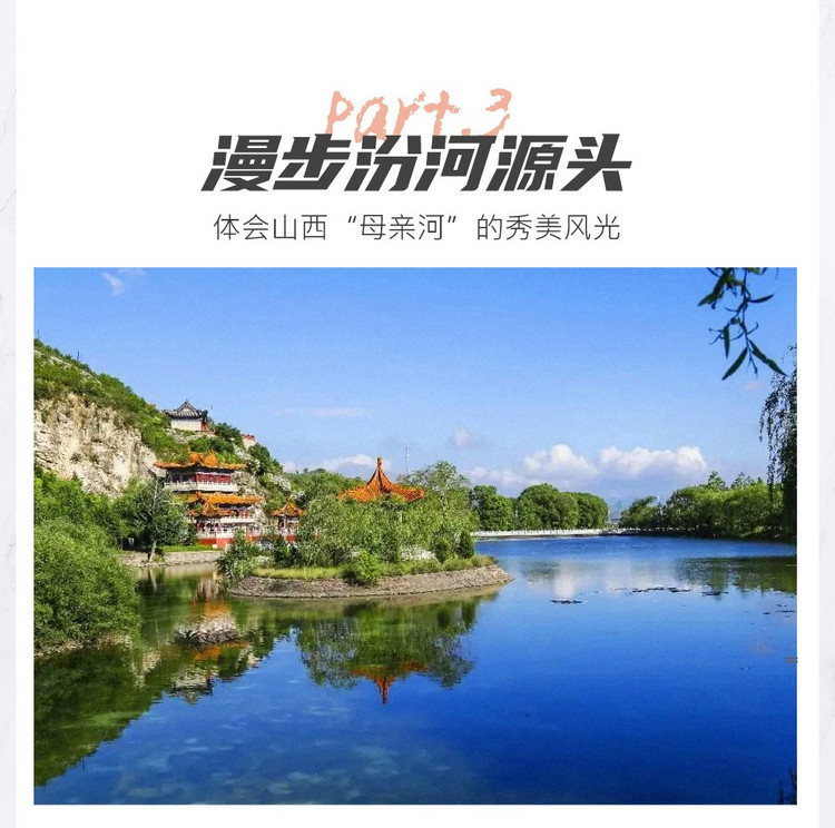 ·【汾河源头】汾河源头是三晋人民饮水思源、寻根感恩的母亲河。汾源四周九山汇聚,溪流淙淙,亭台楼榭,风光旖旎。源头有一水塘,塘上石壁刻有“汾源灵沼”四个大字,壁上雕有一个龙头,龙口中喷出一股清泉,终年流淌不绝。雷鸣寺、魁星阁挺立楼子山上,沾汾河之灵气,气象不凡。自古以来就有三晋第一胜境之美誉。