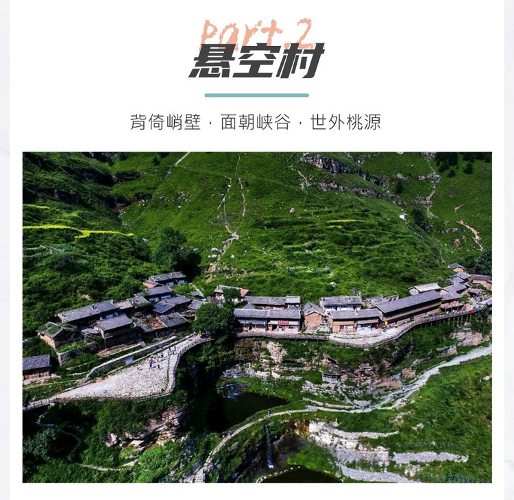 ·【悬空村】悬空村的房屋大多建在百米高的悬崖上,街道由立木支撑,铺设在圆木上,形成了独特的“栈道”。这些村庄不仅风景优美,还保留着许多传统的建筑风格和生活方式。在这里,我们可以体验到石砌小径、古朴的民居,以及村民们日出而作、日落而息的农耕生活。这些村庄的建筑大多有两三百年的历史,主要以石头和木材为建筑材料。这里的居民生活节奏悠闲,主要食物包括莜面、豆面和土豆。悬空村的美丽风光和独特文化吸引了许多人前来探访。