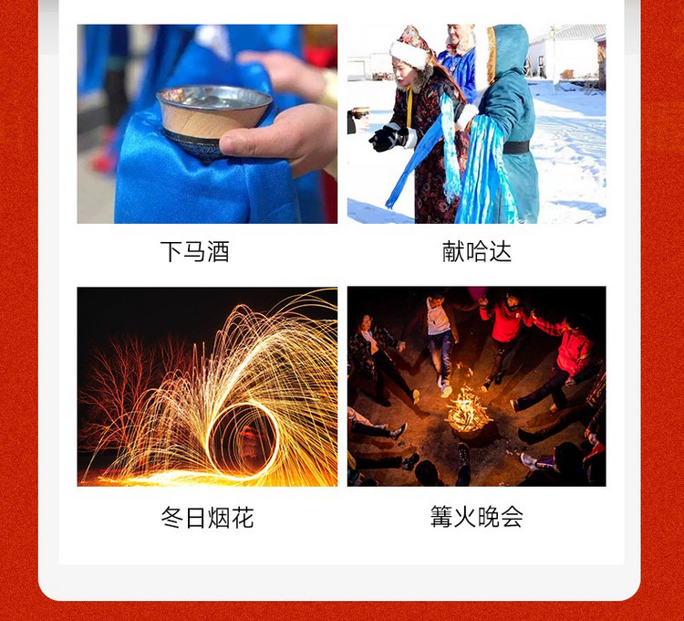 在这里我们可以体验到:雪地勒勒车、雪地爬犁、滑雪圈等娱乐项目。玩累了可以钻进蒙古大帐里听着悠扬的马头琴,喝奶茶、学蒙语、跳蒙古舞,去参加蒙族传统祭火大典。