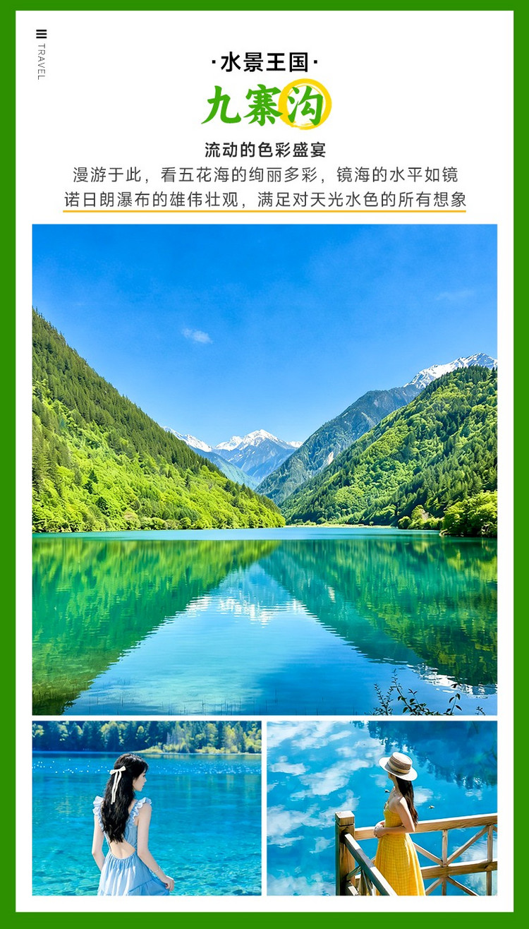 九寨沟的风景四季都十分迷人各有特色,春时嫩芽点绿,瀑流轻快;夏来绿荫围湖,莺飞燕舞;秋至红叶铺山,彩林满目;冬来雪裹山峦,冰瀑如玉。
