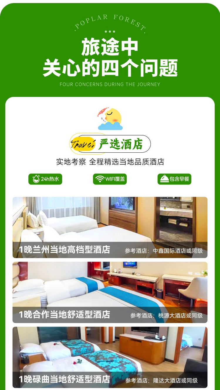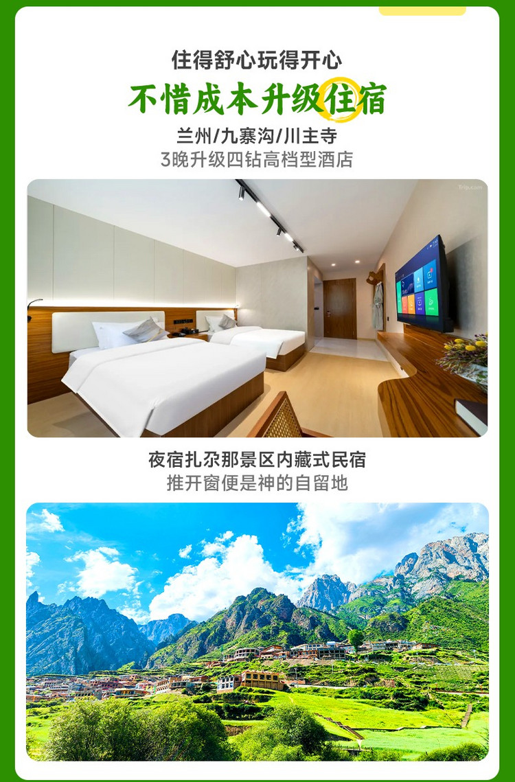今天为全天集合日,我们相聚在兰州,出发前三天短信通知集合酒店。领队会在出发前一天下午18:00前联系您。到达酒店报【甘南九寨沟+姓名】入住酒店。