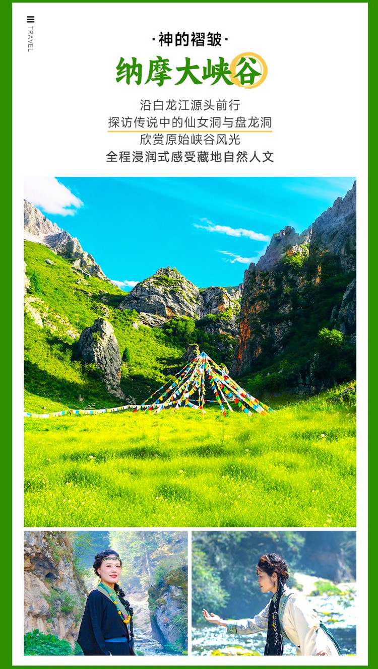 接着我们沿着白龙江的源头,徒步进入【纳摩大峡谷】(徒步约2小时),徒步强度不大,老少皆宜。峡谷两边峭壁高耸,道路狭窄,之后就有步入桃花源的感觉,复行数十步,则豁然开朗。我们在怪石、清泉、峭壁与草甸的交织中,感受这片宁静的净土。
