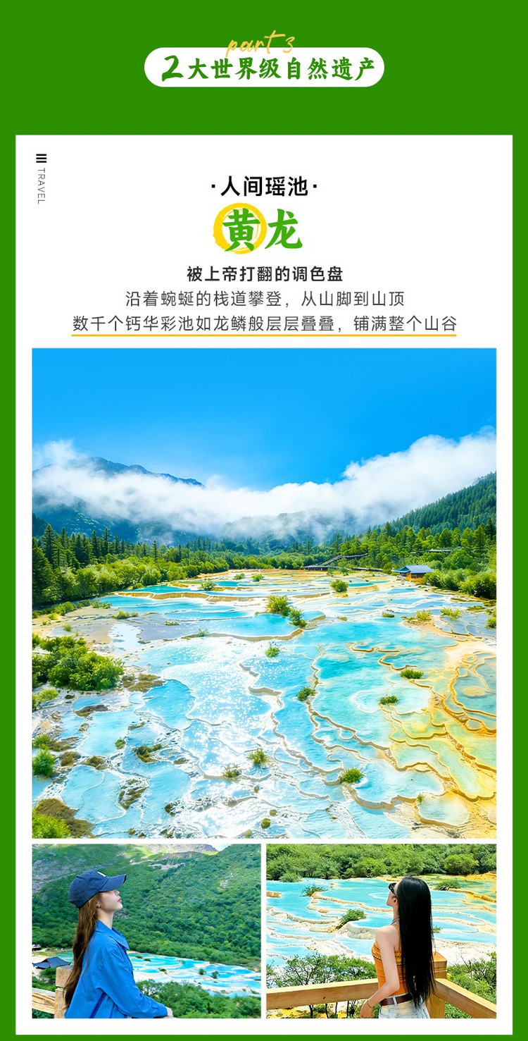 我们继续一路向前,来到素有“人间瑶池”之称的【黄龙风景区】(车程约210公里,用时约4小时,游玩约4-5小时),随着周围景色变化和阳光照射角度变化变幻出五彩的颜色,被誉为“人间瑶池”,以彩池、雪山、峡谷、森林“四绝”著称于世。这里以规模宏大、结构奇巧、色彩丰艳的地表钙华景观为主景,以罕见的岩溶地貌蜚声中外,堪称人间仙境。