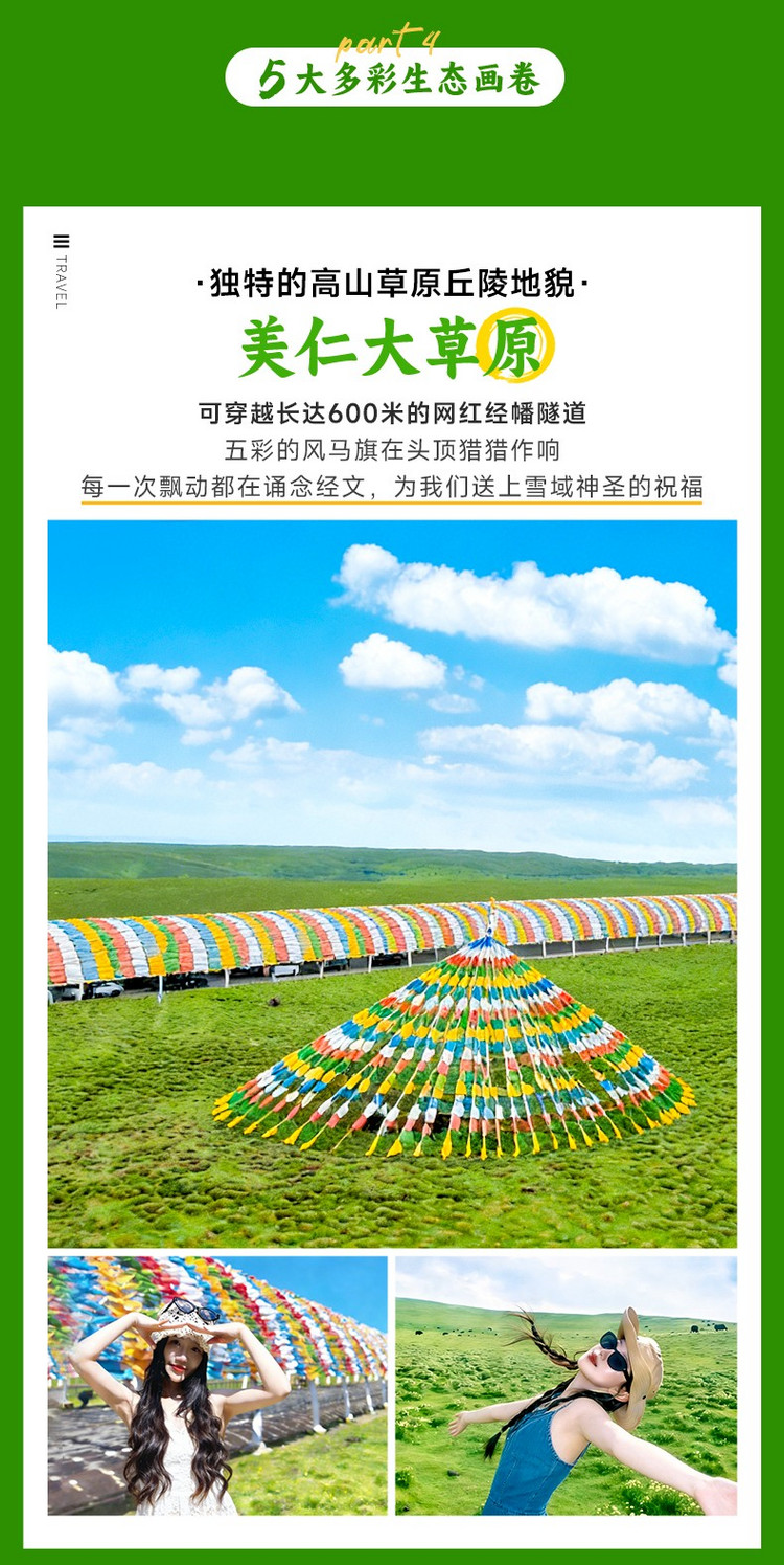 早餐后前往【美仁大草原】(车程约220km,用时约4小时,游玩约2小时),一路风景如画,牛羊成群悠闲自得,座座帐篷如明珠般镶嵌在碧绿的草地上,呈现在你眼前的每一幅景观几乎都似是Windows的桌面一般,令人心情无比舒畅。这里的草原和别处不一样,它的表面是一个个隆起的小草包,这正是它独有的冻胀丘地貌。这里也拥有长达长达600米的网红经幡隧道,拍照非常出片。