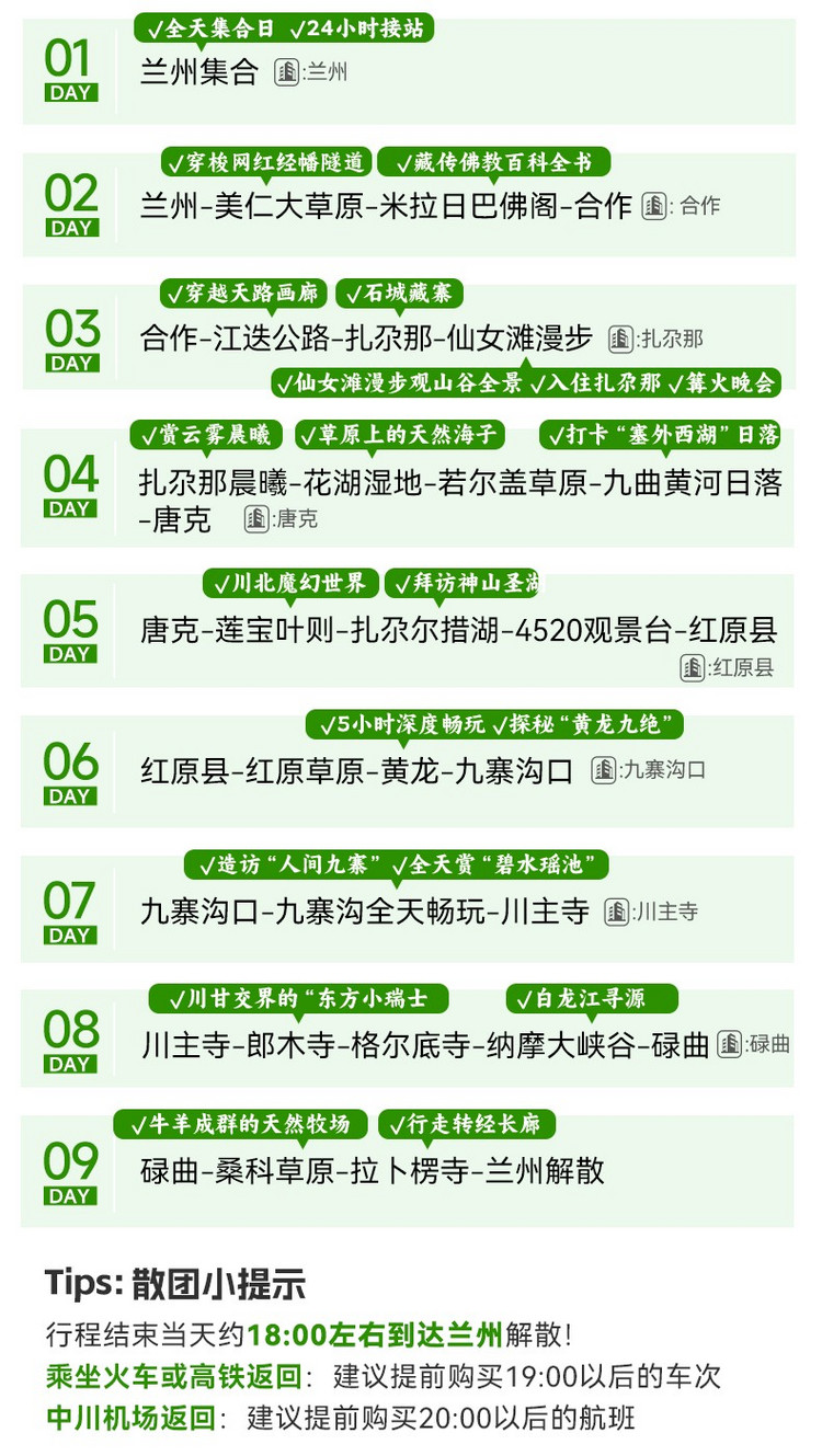 2、行程结束当天18:00左右抵达兰州西站,大家可以依据自己的时间,自行选择继续游玩或是启程回家。火车/高铁建议购买19:00以后的车次,飞机建议购买20:00以后的航班。兰州火车站距离兰州中川机场约68公里,车程约1.5小时。兰州站距离机场大巴客运中心站徒步300米,到达机场71公里,用时1小时25分钟左右,大家根据自己的航班车次选择返程票。