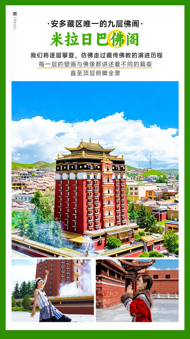 随后到达【米拉日巴佛阁】(游玩约1小时),这里是藏区供奉藏传佛教各派宗师的名刹。米拉日巴佛阁楼高共九层,供奉以米拉日巴尊者及其弟子为主的藏传佛教各派的开宗祖师,有以金刚为主的四密乘的众多佛像、菩萨、护法神等各类佛像1720尊。楼内壁画琳琅满目,与彩绘、唐卡、塑像浑然一体,颇具宗教神秘的色彩。