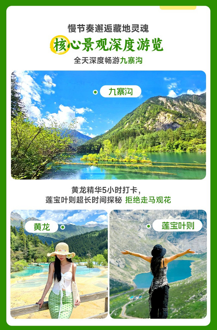 早上出发乘车,前往世界级自然风景区【九寨沟】(全天畅玩),九寨沟因九个藏族村寨而得名,被联合国教科文组织列为世界自然遗产。以“九寨六绝”——翠湖、叠瀑、彩林、雪峰、藏情、蓝冰而闻名。俗话说:''黄山归来不看山,九寨归来不看水'',九寨沟的水如银链胜似彩虹,将高原朴素的山林沟谷描抺的风姿绰约,妖娆迷人。九寨沟的瀑布飞流直下,溅的水珠如同珍珠一般美丽。九寨沟的森林处处散发着原始气息……九寨沟的景色真是此景只应天上有,''人见难得几回见。''