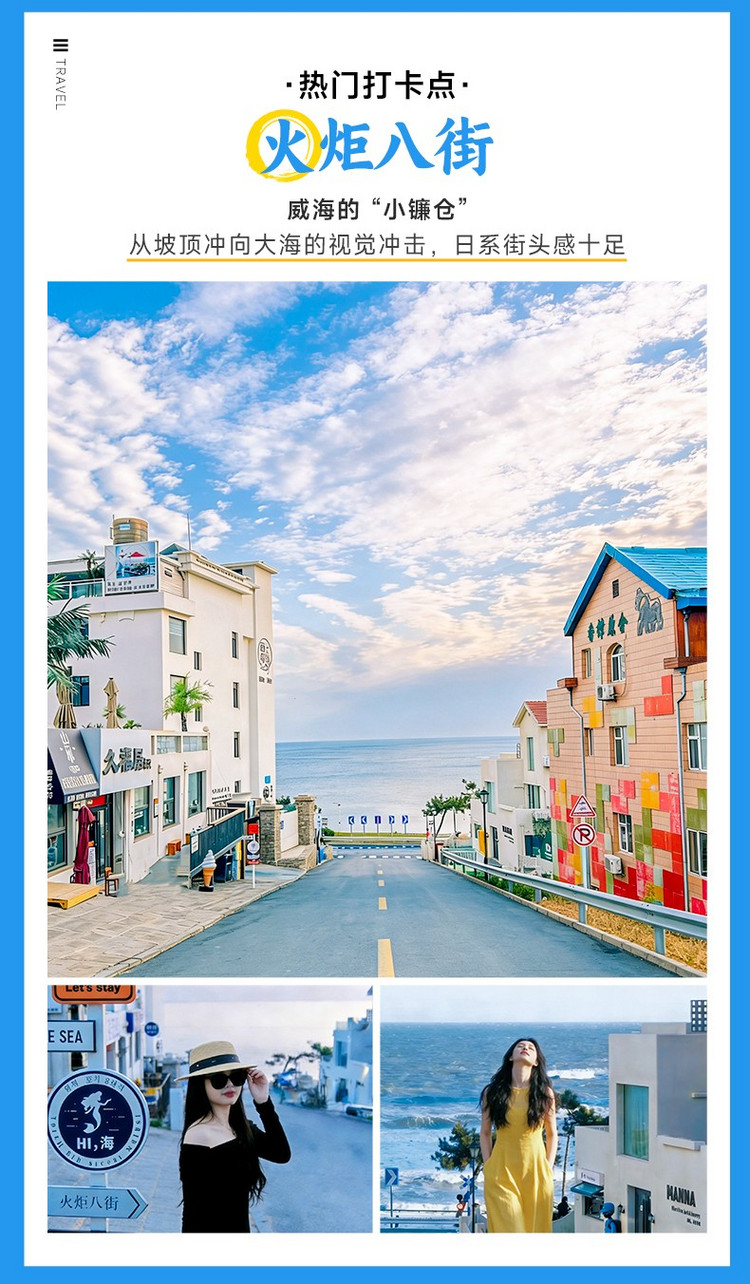 ·【火炬八街】冬日 “小镰仓” 的雪海童话秘境,是威海具代表性的网红打卡地,因酷似《灌篮高手》经典场景被称为 “中国小镰仓”。冬季雪落街道,彩色小屋覆雪如童话世界,尽头直通湛蓝大海,蓝白交织的雪景堪称一绝。在彩色小屋前打卡,喝着热咖啡看雪落大海,体验一场难忘的 “雪窝子” 威海冬日之旅。