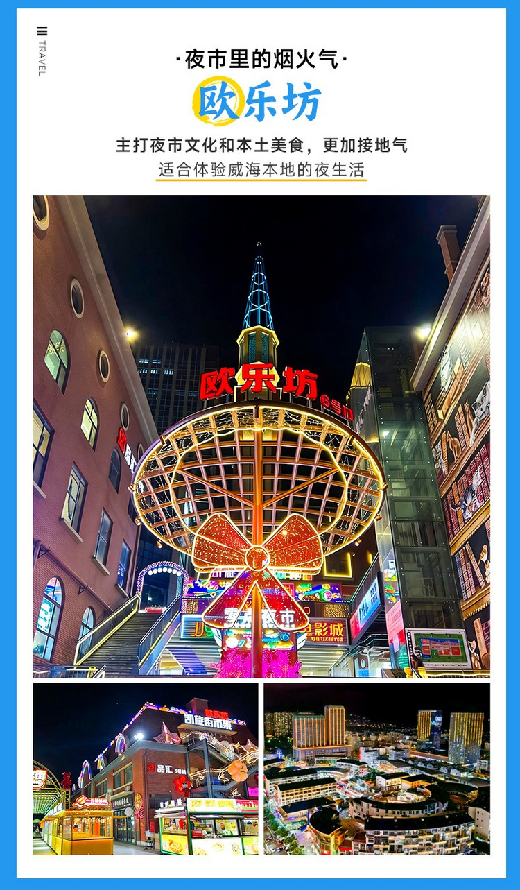 ·【欧乐坊】是威海的一个综合性商业街区,有各种各样的美食小吃、餐厅、咖啡馆等,性价比高,你可以在这里品尝到海鲜大餐以及其他各地美食,感受威海的烟火气