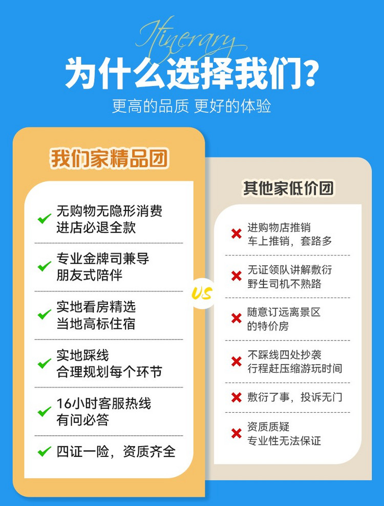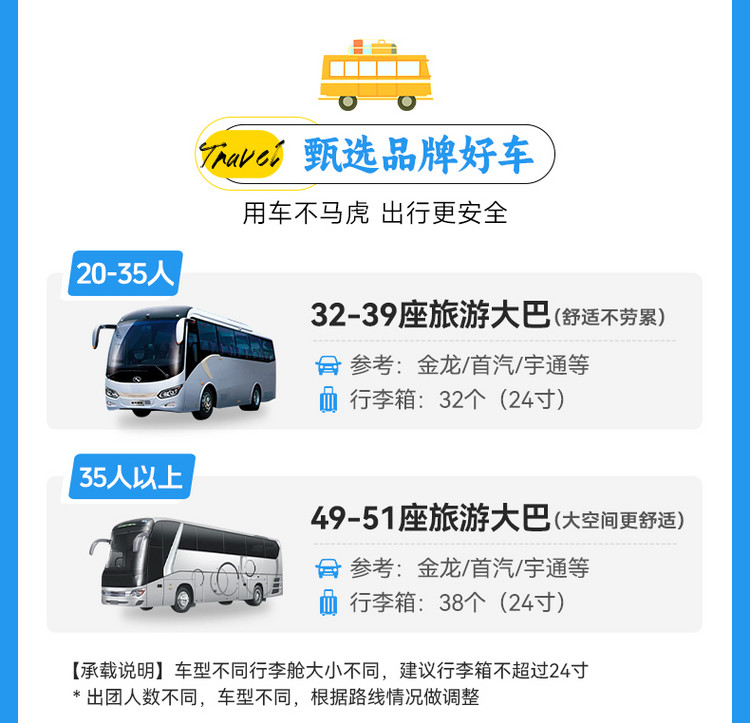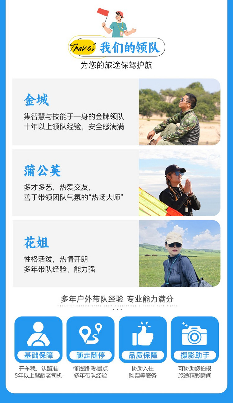 2、以上行程时间及顺序供参考,受天气、交通、景区调控及队员体能等不同影响有可能会调整,以领队实际安排为准。