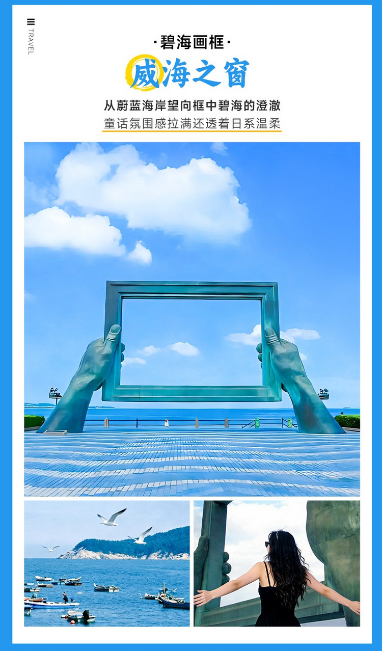 ·【威海之窗】是威海公园中段的标志性雕塑,由艺术家傅中望设计,国家地理杂志称其为 "透视中国的窗口",路透社评价为 "中国最美城市雕塑之一"。这座纯白钢结构的艺术装置以双手托举空相框的造型,将碧海蓝天、刘公岛与城市天际线纳入其中,成为威海最具辨识度的城市名片和免费网红打卡地。