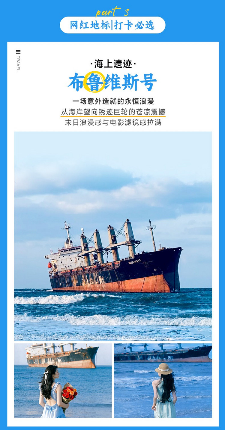 ·【布鲁维斯号】这是一艘搁浅在威海的巴拿巴籍邮轮,布鲁威斯号的搁浅是一场意外,却造就了一处独特的海岸景观。锈迹斑斑的巨轮与碧海蓝天、皑皑白雪(冬季)相映成趣,既展现了大自然的力量,也成为了现代文旅融合的典范。雪后船身与白雪、蓝海形成三色奇观,宛如极地探险场景,冬季来威海,一定不要错过这场 "孤独巨轮" 的视觉盛宴。