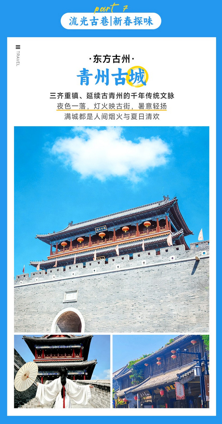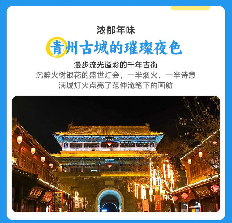 夜幕降临,古城又是另一番景象。春节期间的青州古城,最令人期待的就是花灯。主干道上会悬挂起火红的灯笼,而在阜财门、偶园街等重要地点,则会设置造型各异的大型主题灯组,例如寓意吉祥的龙凤呈祥等 。当万千灯盏同时点亮,整座古城仿佛一条流动的光之河,非常适合拍照打卡 。