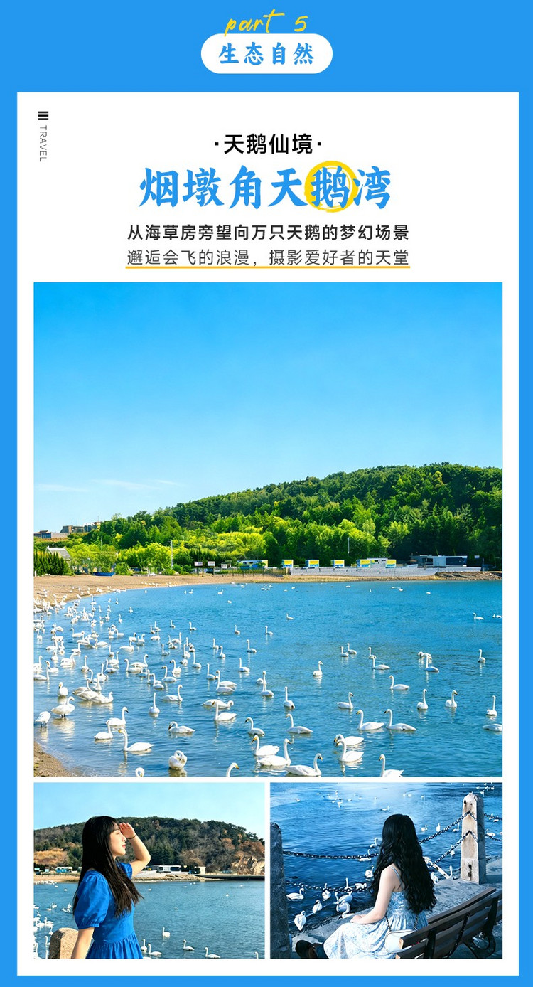 ·【烟墩角】位于山东半岛东端的荣成市俚岛镇,是一座三面环海的古老渔村,因明初为抗击倭寇在村东南崮山之巅修建烟墩(烽火台)而得名。这里既是联合国最佳旅游乡村,也是西伯利亚大天鹅的冬季栖息地,更保存着 240 余栋、1300 余间胶东传统海草房,形成了 “万顷海天碧,一池雪花白” 的独特景观,雪后天鹅与海草房构成绝美画面,是烟墩角冬季最独特的景观,成为威海冬季最具魅力的旅游目的地之一。洁白的天鹅在海面上游弋,听到它们清脆的叫声,感受到古老渔村的宁静与温暖。冬季来此,让身心沉浸在这片纯净的海湾,体验一场难忘的童话之旅。