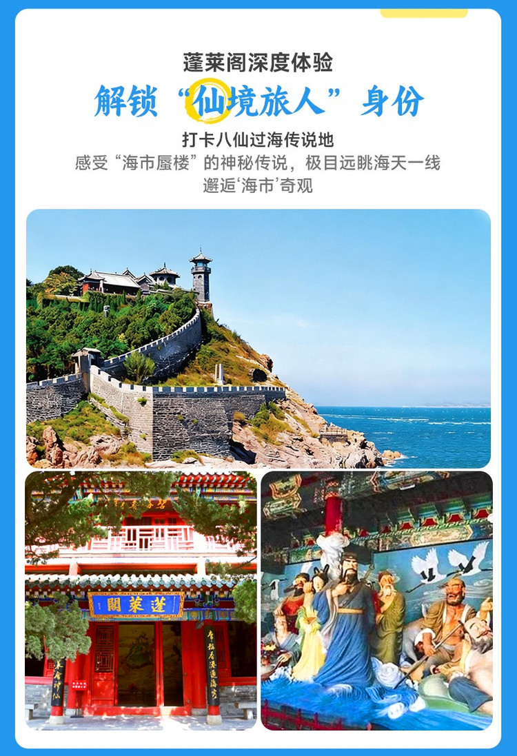 ·【蓬莱阁】国家5A级景区-“中国四大名阁”之一·素以“人间仙境”著称于世,因其“八仙过海”传说和“海市蜃楼”奇观享誉海内外;蓬莱阁历经近千年风雨沧桑,如今已发展成为以古建筑群为中轴,蓬莱水城和田横山为两翼,四种文化(神仙文化、精武文化、港口文化、海洋文化)为底蕴,山(丹崖山) 、海(黄渤二海)、城(蓬莱水城)、阁(蓬莱阁)为格局,登州博物馆、古船博物馆等20余处景点为点缀,融自然风光、历史名胜、人文景观于一体的风景名胜区;