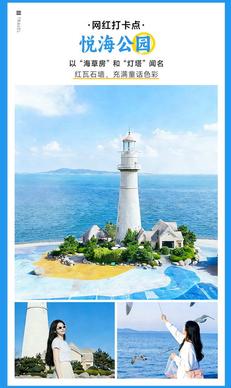 ·【悦海公园】位于威海市区南部海滨,是威海 "海滨生态公园风景带" 的核心节点之一。以49 米高灯塔和传统海草房为标志性景观,主打文艺浪漫与亲子休闲,是威海本地人日常散步、外地游客必打卡的免费海滨公园,尤其冬季雪后更显静谧童话感。
