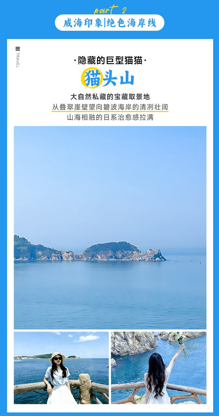·【猫头山】位于环翠区孙家疃靖子村,是威海千里山海自驾公路的 “钻石节点”,因山体形似匍匐眺望的巨猫得名,坐南朝北,两只前爪伸入海中,双耳竖立,弓身眺望大海,雪后 “猫帽子” 更显可爱,三面环海,海蚀地貌险峻,冬季雪落猫头,一半山景一半海,雪雾萦绕中宛如童话。
