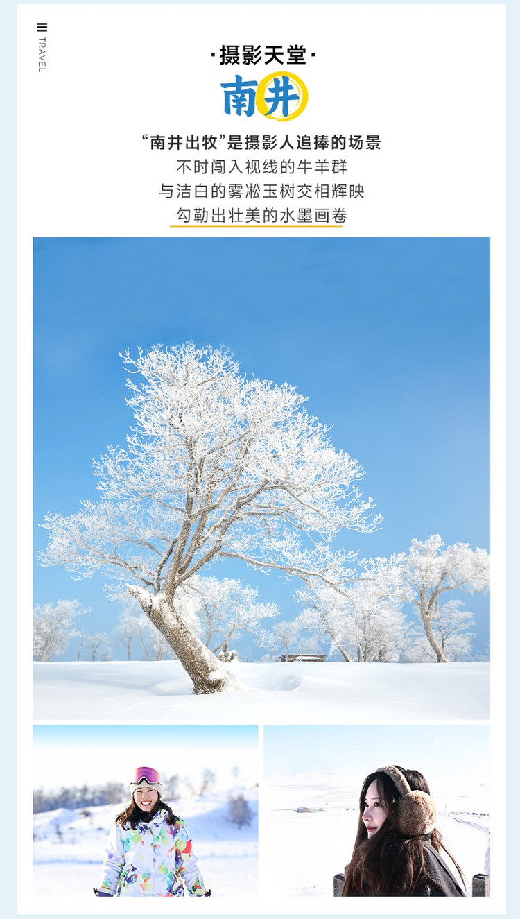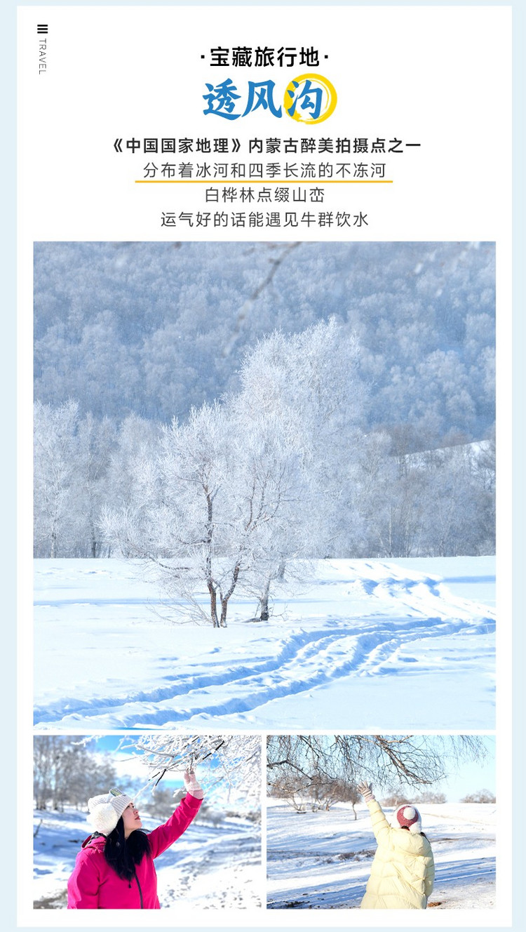 观赏日出后,大家一起前往【透风沟】,这里是坝上草原的经典摄影点,中间流淌着盘龙河水,岸两边灌木林,白桦林形成独特的生态景观,都是拍摄雾凇、冰面水泡子、内蒙人家等绝佳素材。随后,我们前往【南井】,冬季的南井拍雪地水墨丹青,白桦倒影。蔡树分布匀称,美轮美奂。