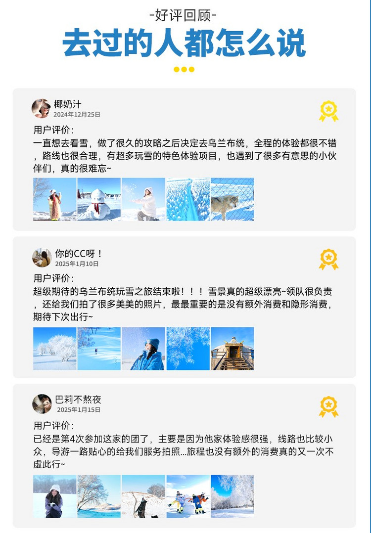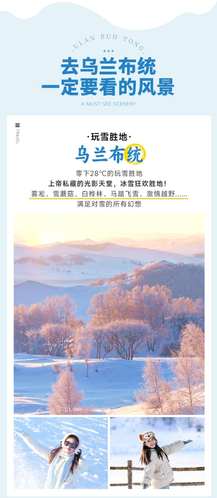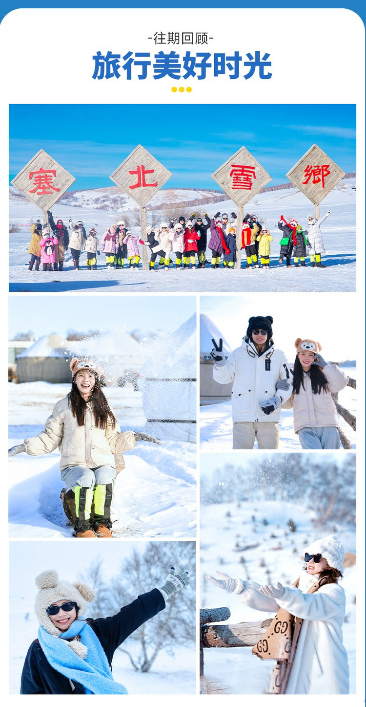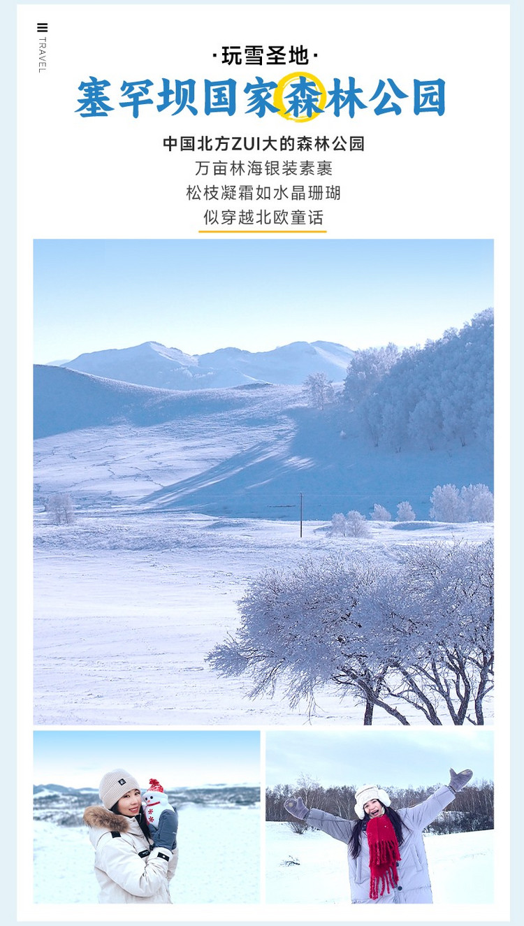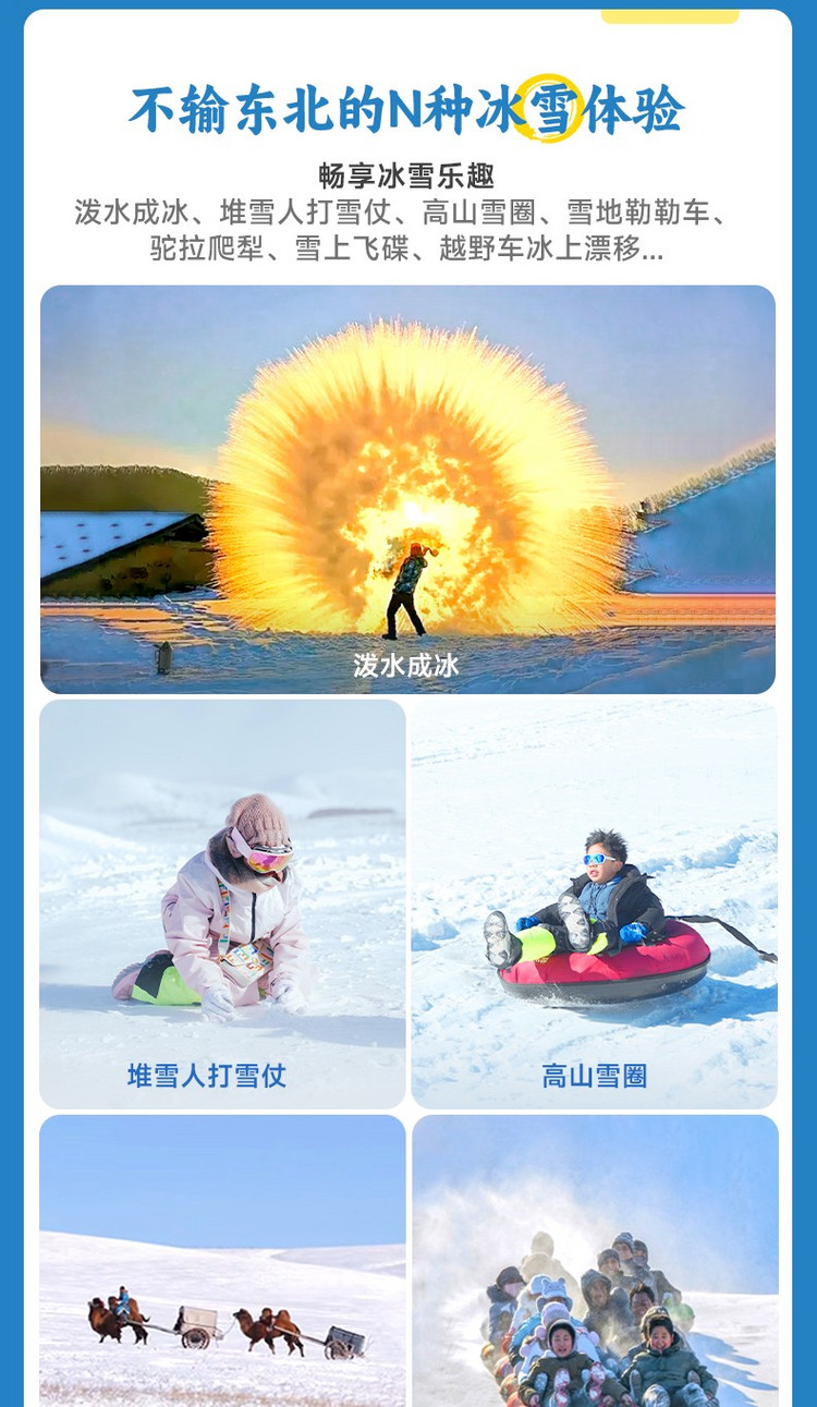 下午前往【塞北雪乡】【白家窝铺】玩雪撒欢。在这里,我们还可以体验泼水成冰,热水的水蒸汽四散开来完全暴露在空气中,在乌兰布统极度低温的状态下,就会形成类似雾状的形态,也可以堆雪人、打雪仗、高山滑雪......多种游玩项目带你找回童年的简单快乐!