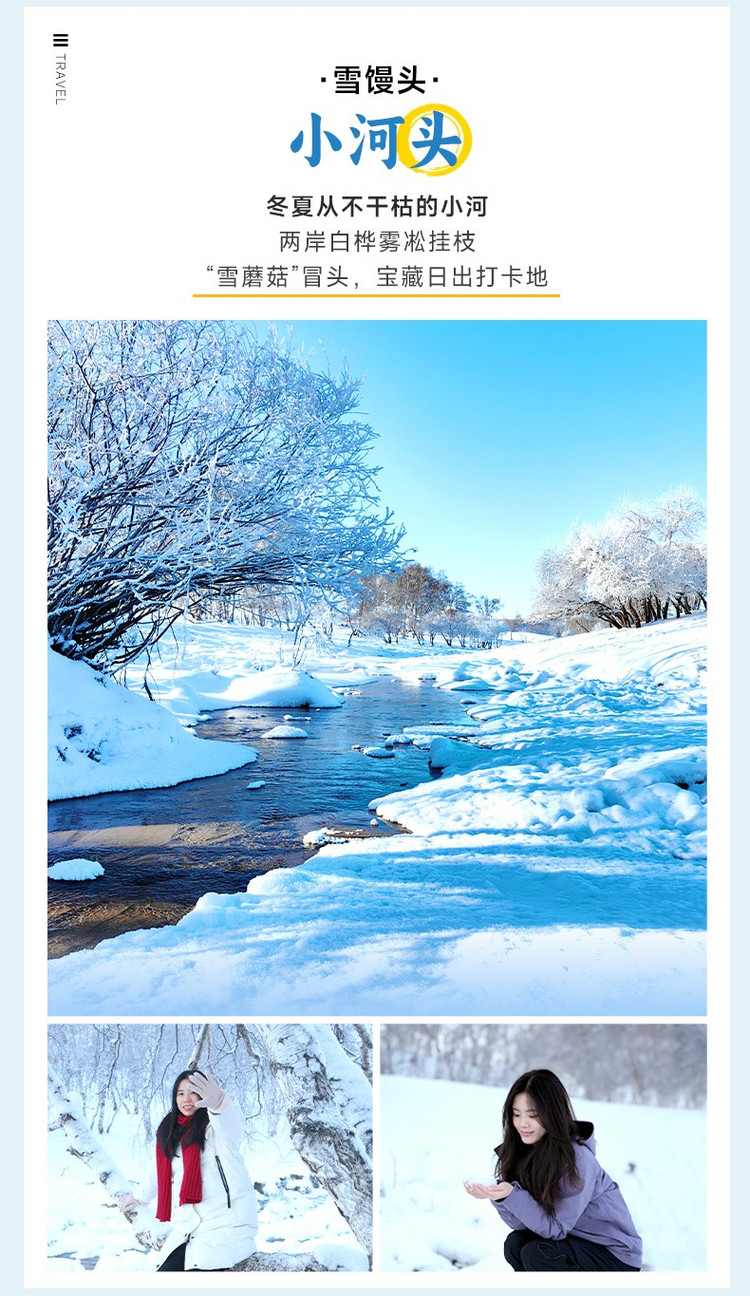 今天早起前往【小河头村】看日出,冬日的小河头依然有活水流淌,冰上有河柳灌木被冰雪覆盖,河水鼓泡冻成的冰花是这里的一绝,早晚雾气升起,极易形成雾凇。在这里感受冬季草原日出的壮丽,你可以看到雪中挺拔的白桦林,蜿蜒河流中洁白的雪馒头,小河头村风光、羊群出牧,你可以用手中的相机,定格冬季坝上的雪域风光。拿出准备好的保温杯,挑战【泼水成冰】,小伙伴们用手机拍下这神奇的一刻。