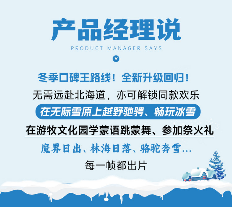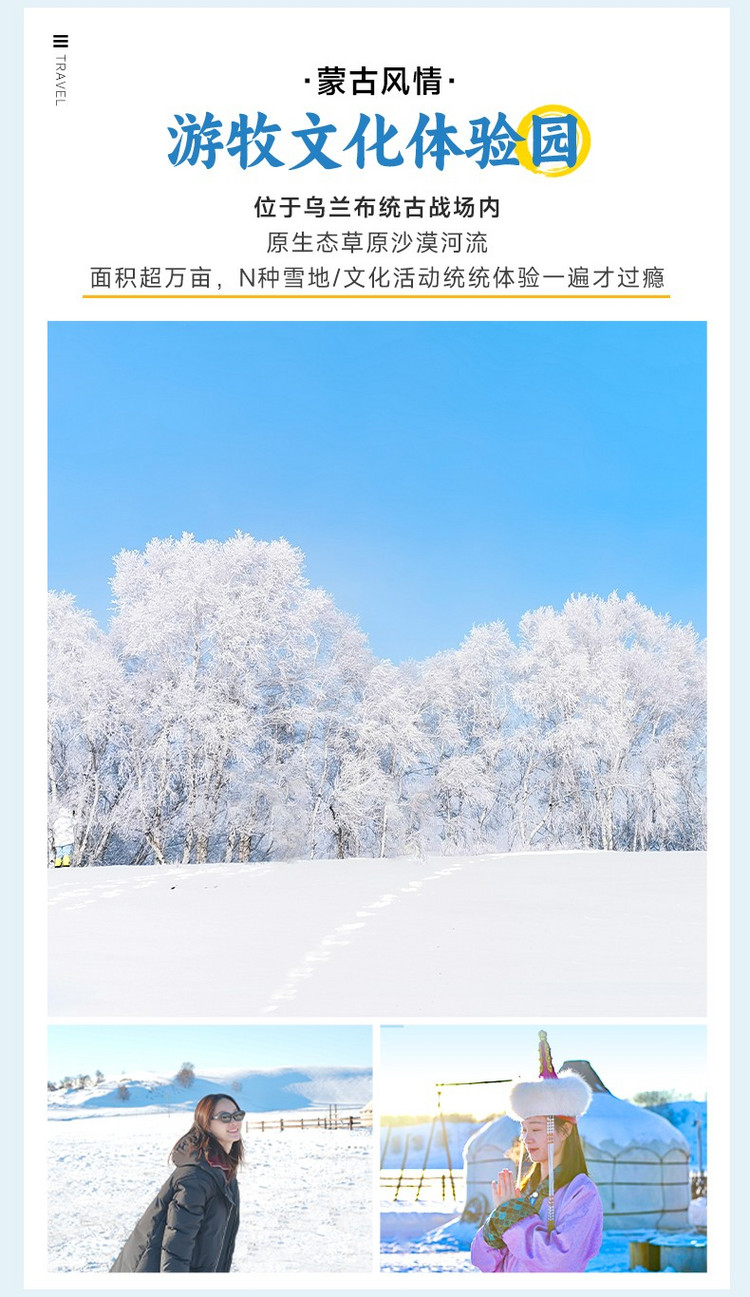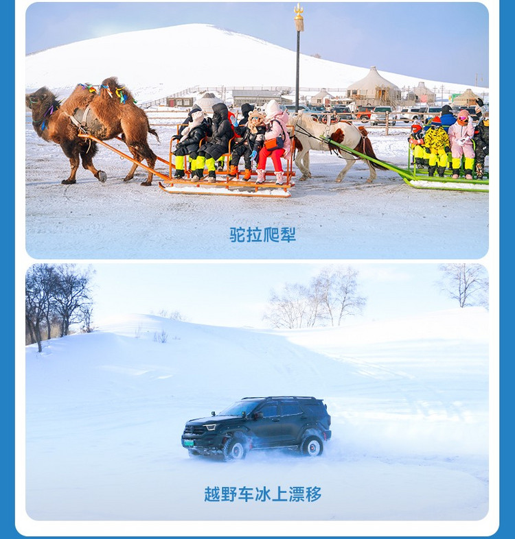 午餐后,我们到达【游牧体验园】,在这里可以放肆开玩,体验雪地爬犁冲浪、高山滑雪圈,参加蒙古族祭火大典,在暖喝的蒙古包内与热情蒙古人学蒙语、跳蒙古舞,观看群狼夺肉、马头琴表演,喂食草原精灵梅花鹿,品尝下马酒、奶皮子、奶豆腐,全方位感受蒙古族风情。
