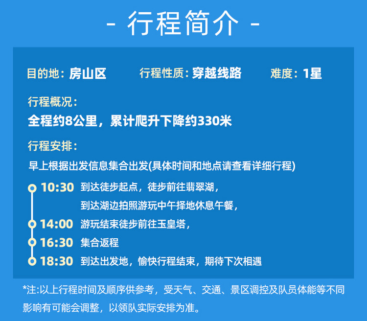 注:以上时间为正常安排时间,如遇天气、道路堵车、景区管控、防火管控等外在因素影响,以领队安排为准;