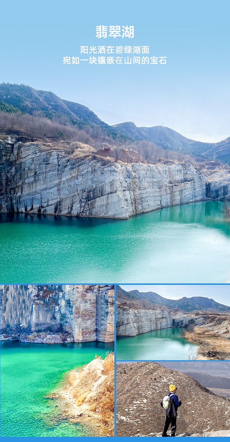 高庄村位于房山区大石窝镇,是北京乃至全国最著名的汉白玉产地之一,在高庄村的村口有个巨大影壁,上面刻着“汉白玉的故乡”这几个大字,这曾经是村子多年以来的荣耀的象征,而今我们所看到得翡翠湖便是曾经的矿坑!因矿石中特有的成分,阳光下的水面呈现出特有的蓝绿色,在不同的角度,拍摄出来的水便呈现出不同的颜色,到真真是有几分小九寨的韵味了!