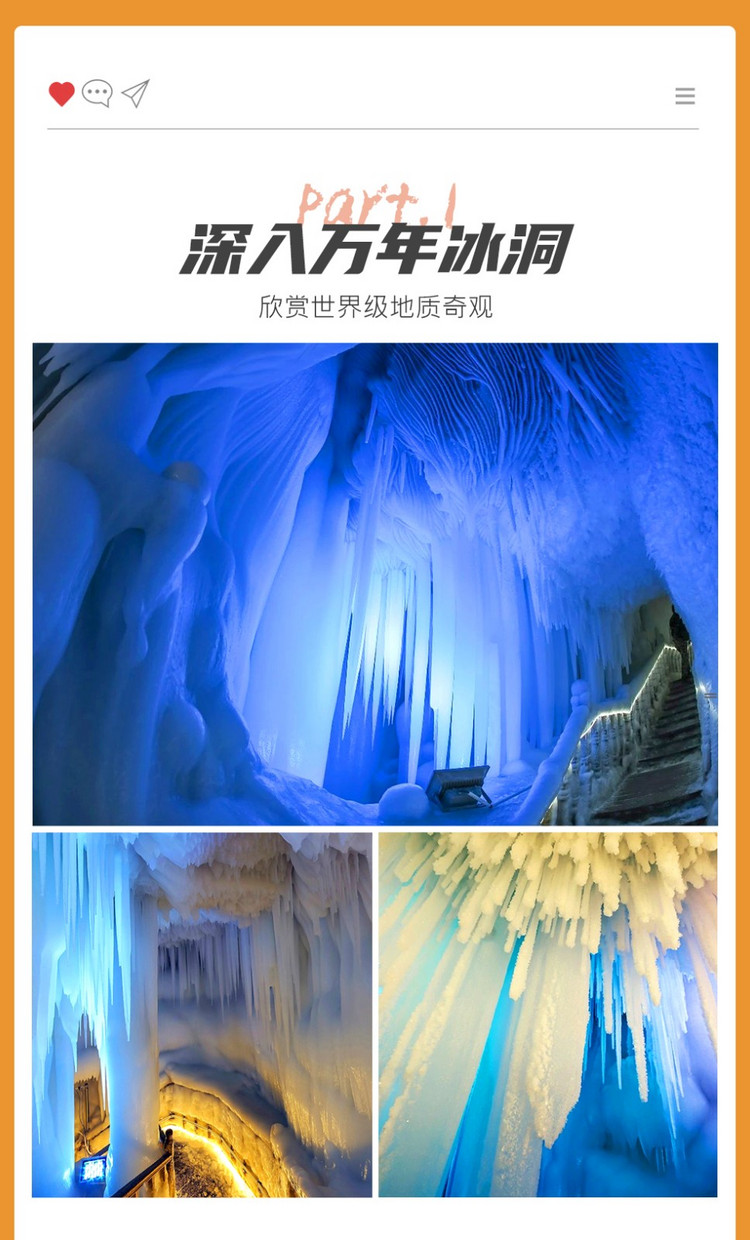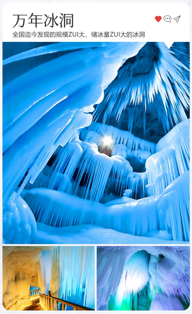 ·【万年冰洞】冰洞的形成原因至今仍是个迷,距这里不远的地方还有一座“火山”,我们在来的途中就能看到“冰火两重天”的奇景!这里分为五层,我们通过钻冰洞、下冰梯、过冰栈来游览这里,眼睛所看到的是厚厚的冰层,如剑般的冰柱、仿佛倾泻而下的冰瀑,还有冰床、冰花、冰帘等等,在彩灯的映衬下更显得神秘。