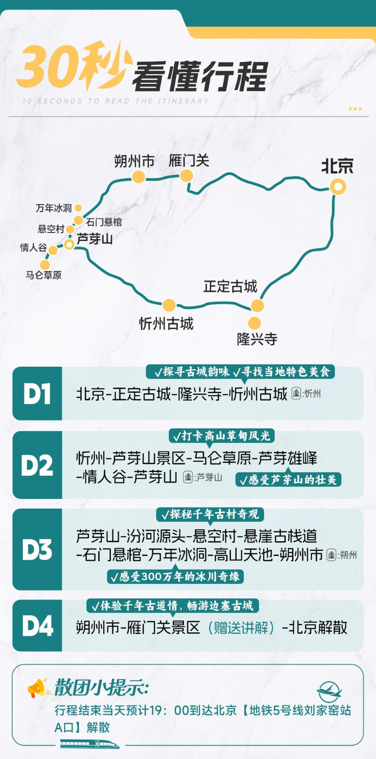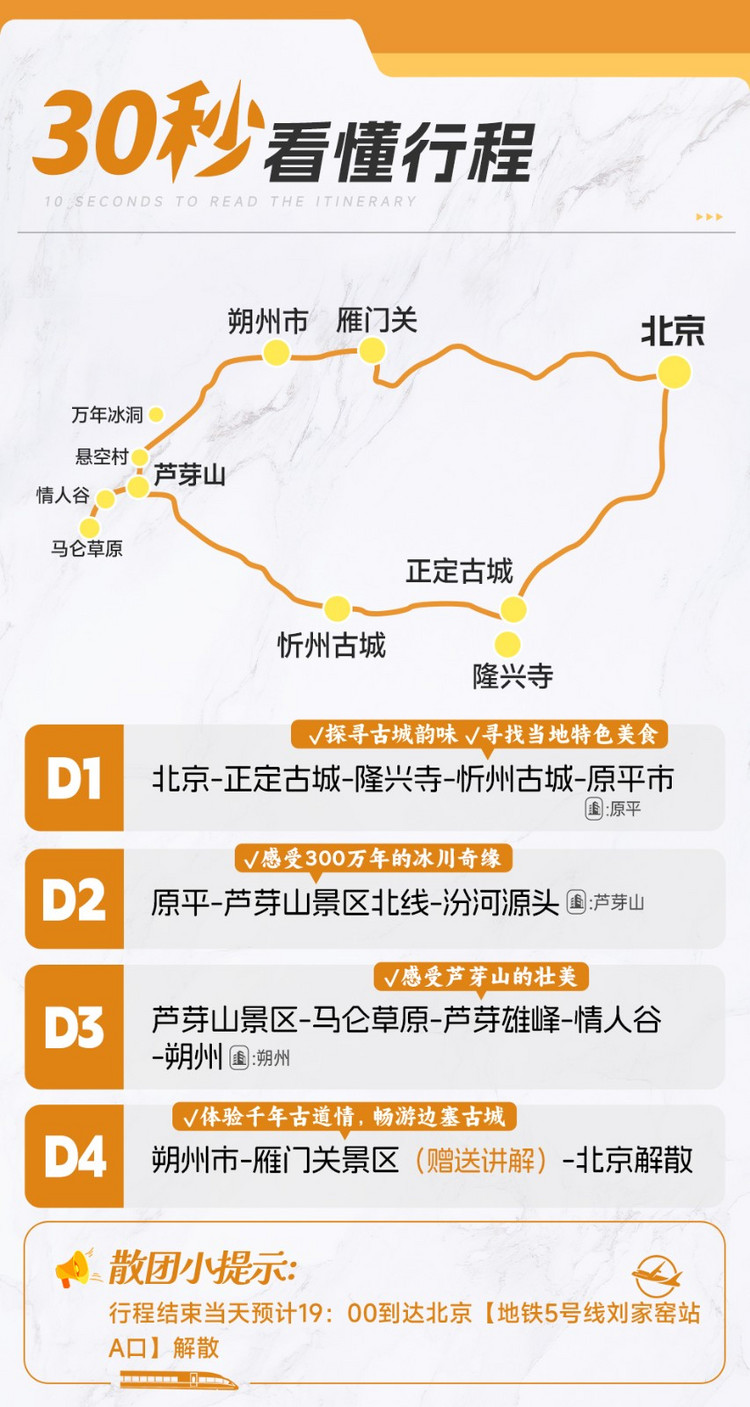 09:00左右,我们从北门进入【雁门关景区】(游览参考时间3小时左右),大家自行午餐,游览结束后需原路返回。