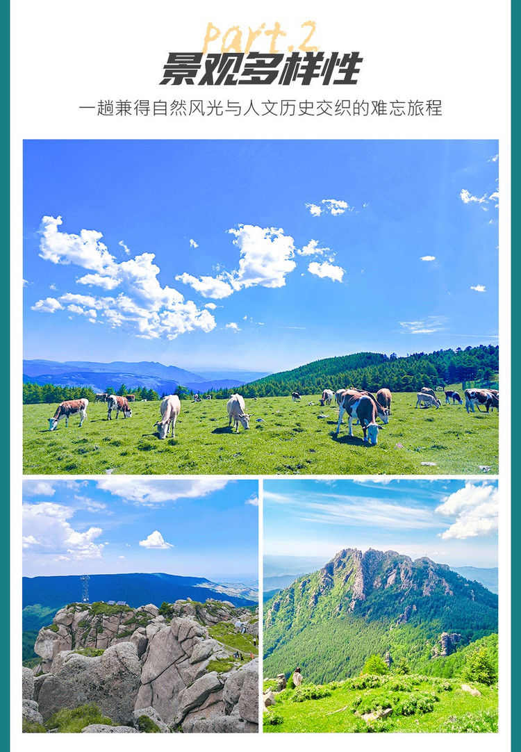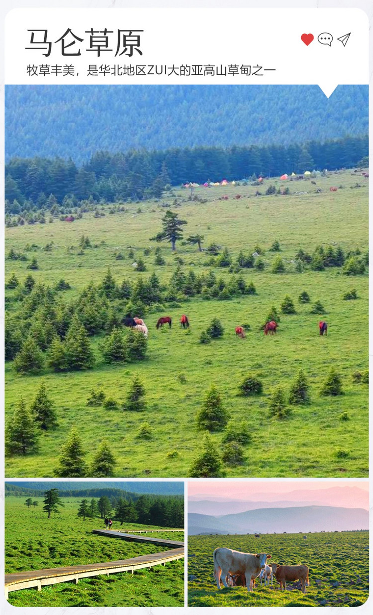 ·【马仑草原】马仑草原海拔2721米,面积6000多亩,形成于75万年前的新生代第四纪冰川期,与芦芽山南北相望,是华北地区最大的亚高山草甸之一。这里牧草肥沃,是历代帝王牧养战马的基地。马仑草原将草甸、森林、高山、峡谷、奇松、怪石、长城、将台、基塔融为一体。东南隅有怪松苑,正南面是奇石坡,西南隅坍塌的舍利塔群半掩半露隐没于草丛中,北齐长城纵贯草原东西。