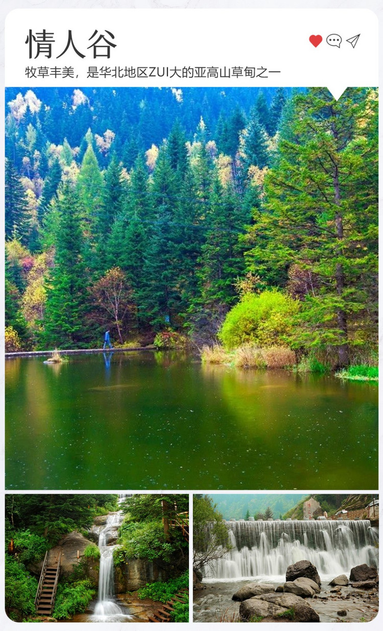 芦芽山西线:游客中心--摆渡车换乘--马伦草原--芦芽雄峰--芦芽美食街--情人谷