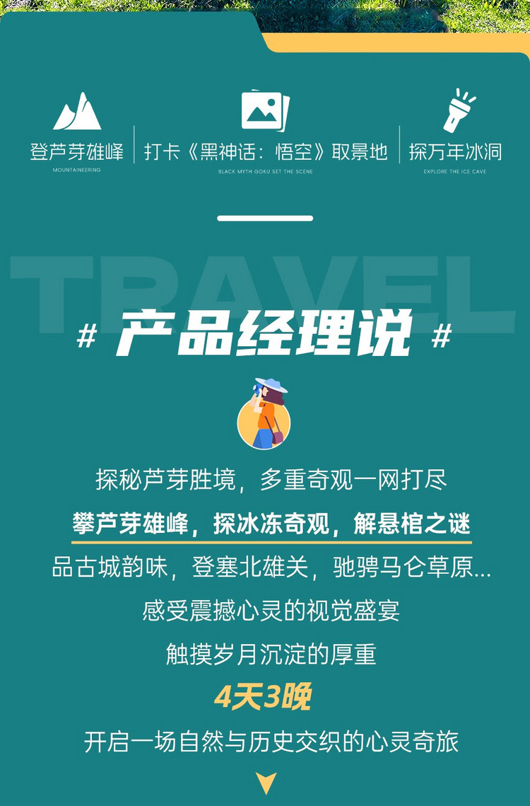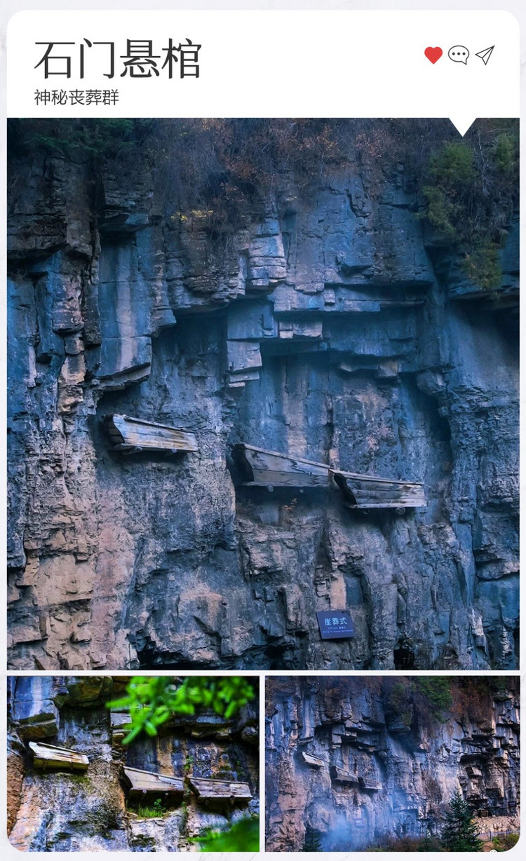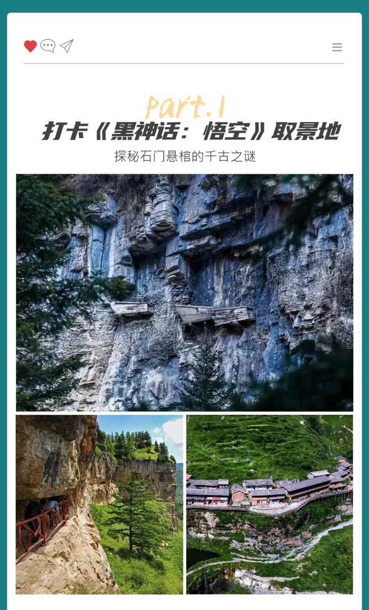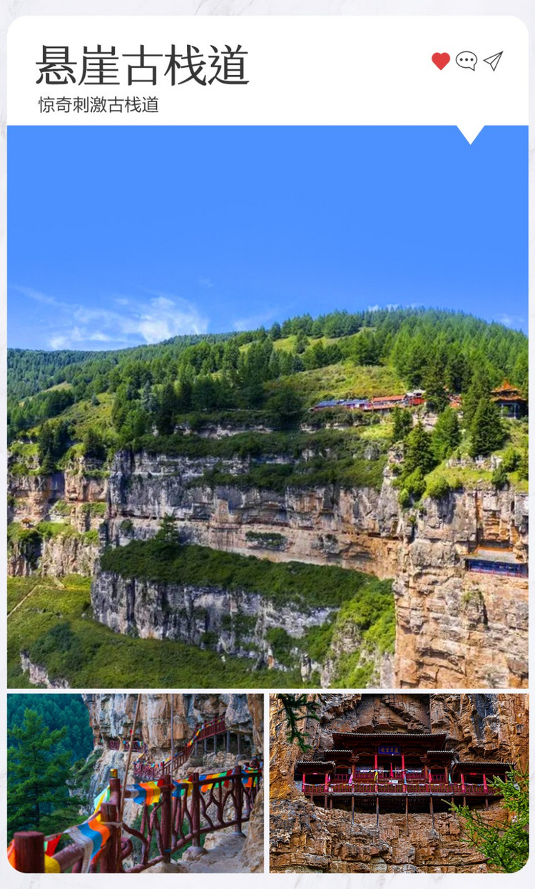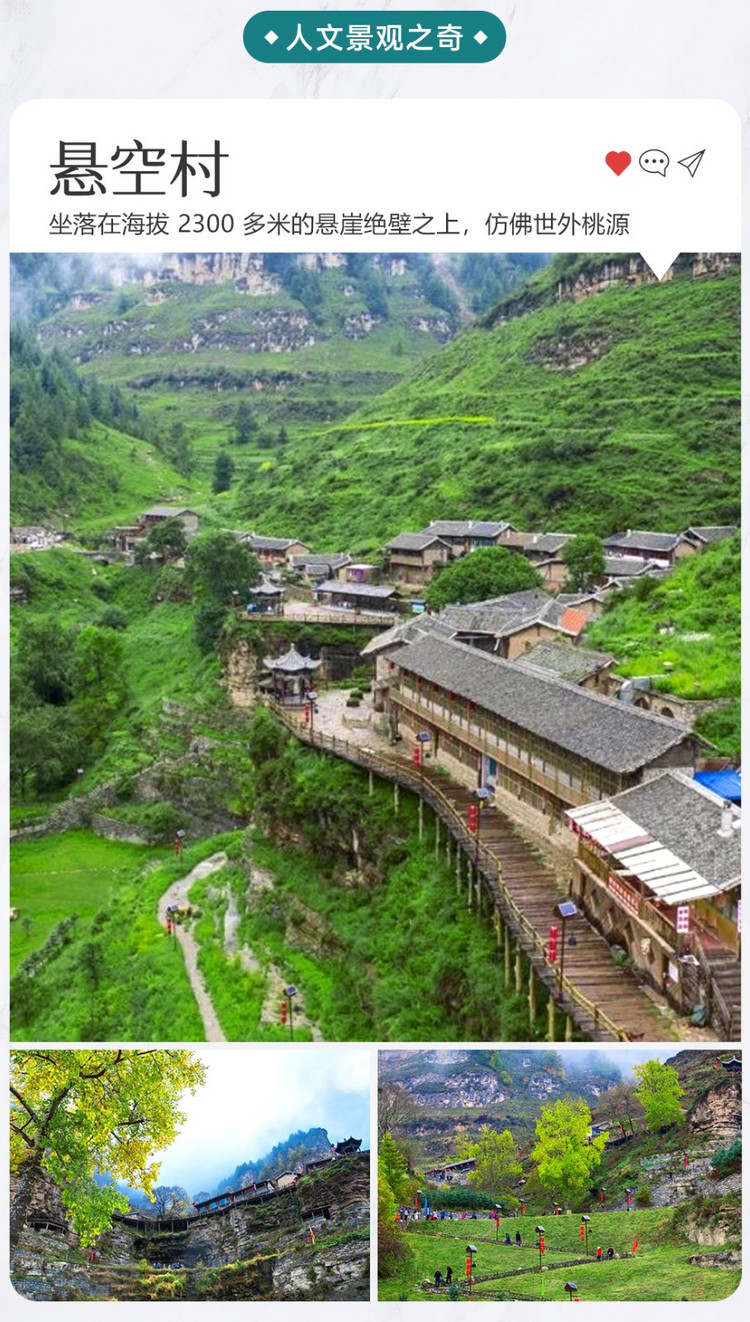 ·【悬空村】悬空村的房屋大多建在百米高的悬崖上,街道由立木支撑,铺设在圆木上,形成了独特的“栈道”。这些村庄不仅风景优美,还保留着许多传统的建筑风格和生活方式。在这里,我们可以体验到石砌小径、古朴的民居,以及村民们日出而作、日落而息的农耕生活。这些村庄的建筑大多有两三百年的历史,主要以石头和木材为建筑材料。这里的居民生活节奏悠闲,主要食物包括莜面、豆面和土豆。悬空村的美丽风光和独特文化吸引了许多人前来探访。